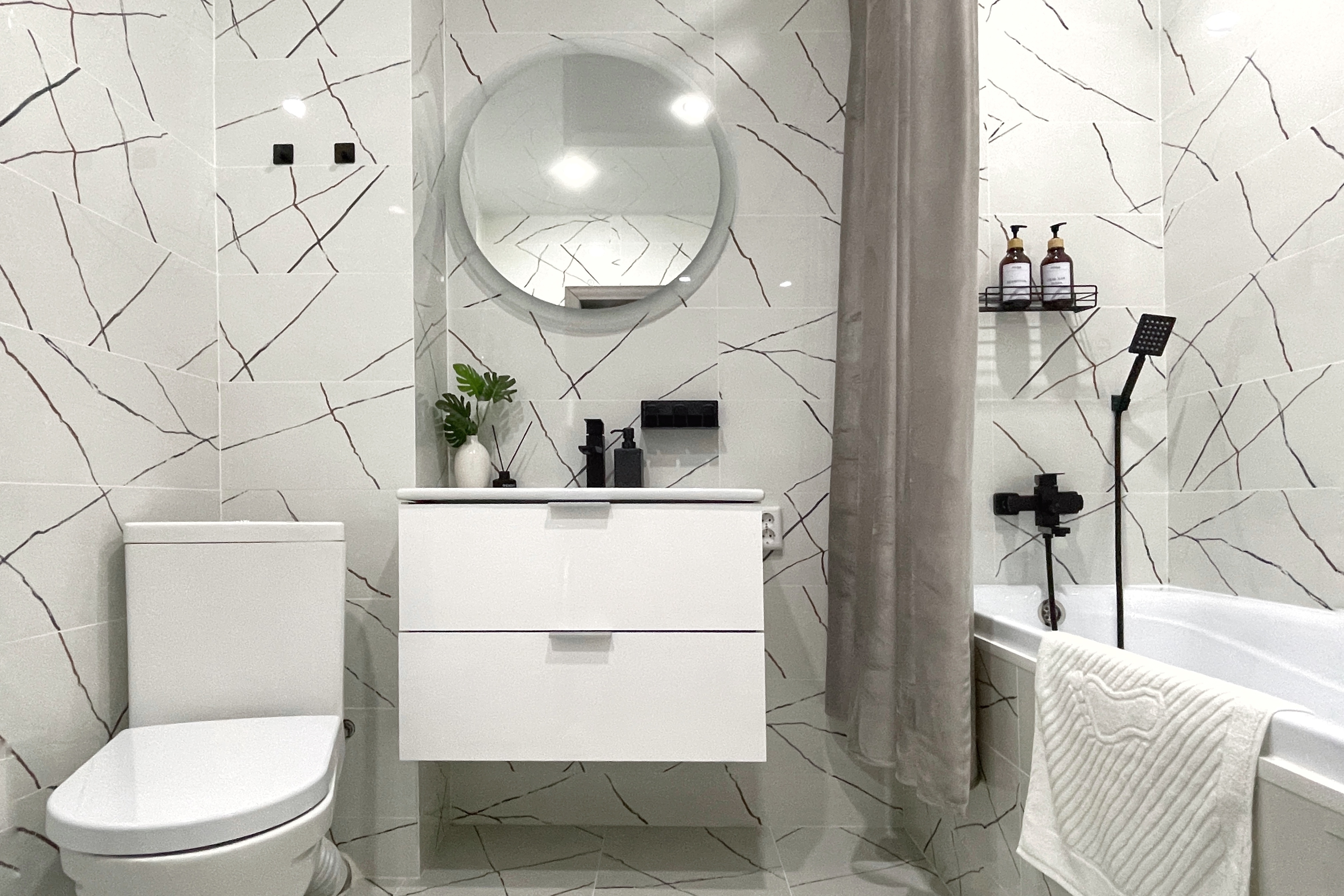 - Санузел с большой ванной, стиральной машиной, феном и утюгом.
