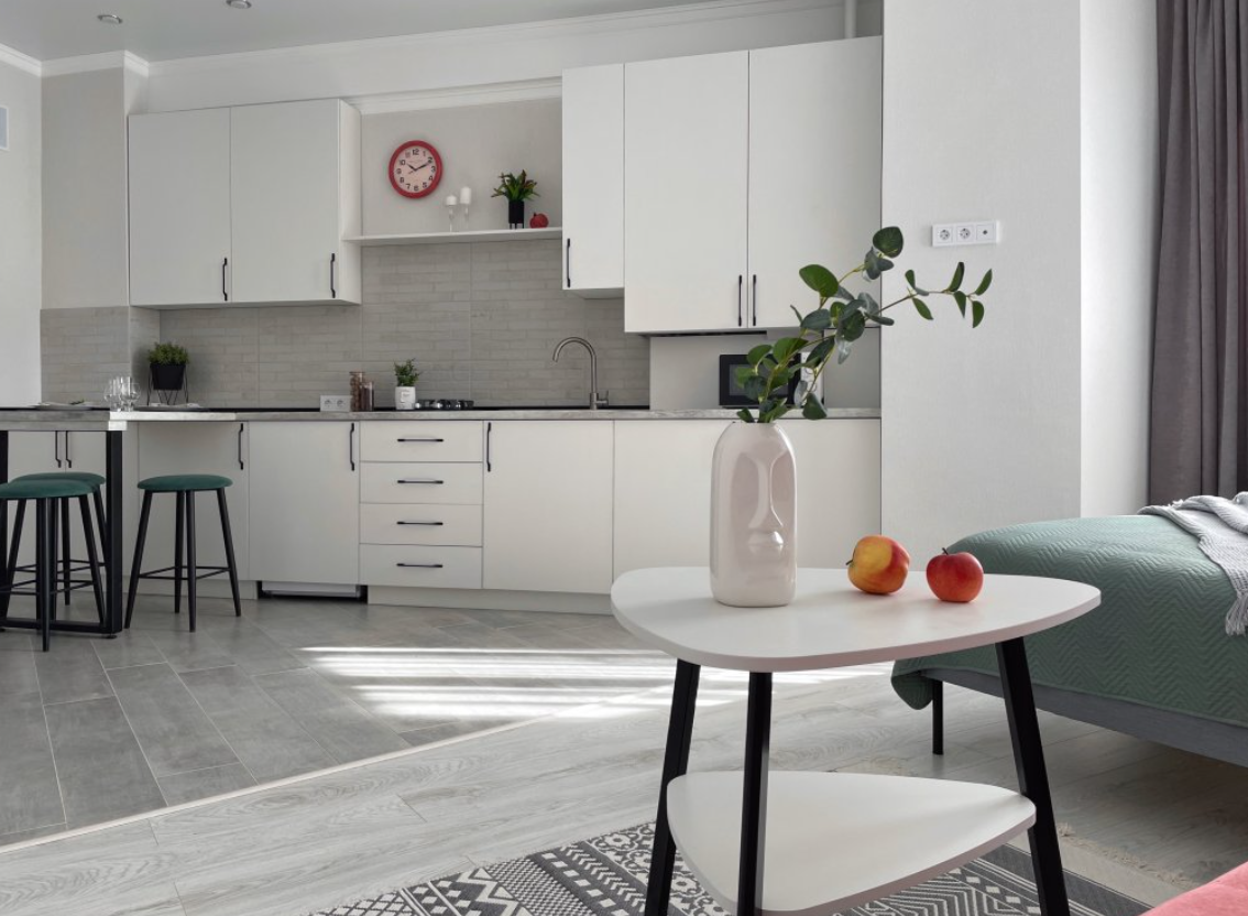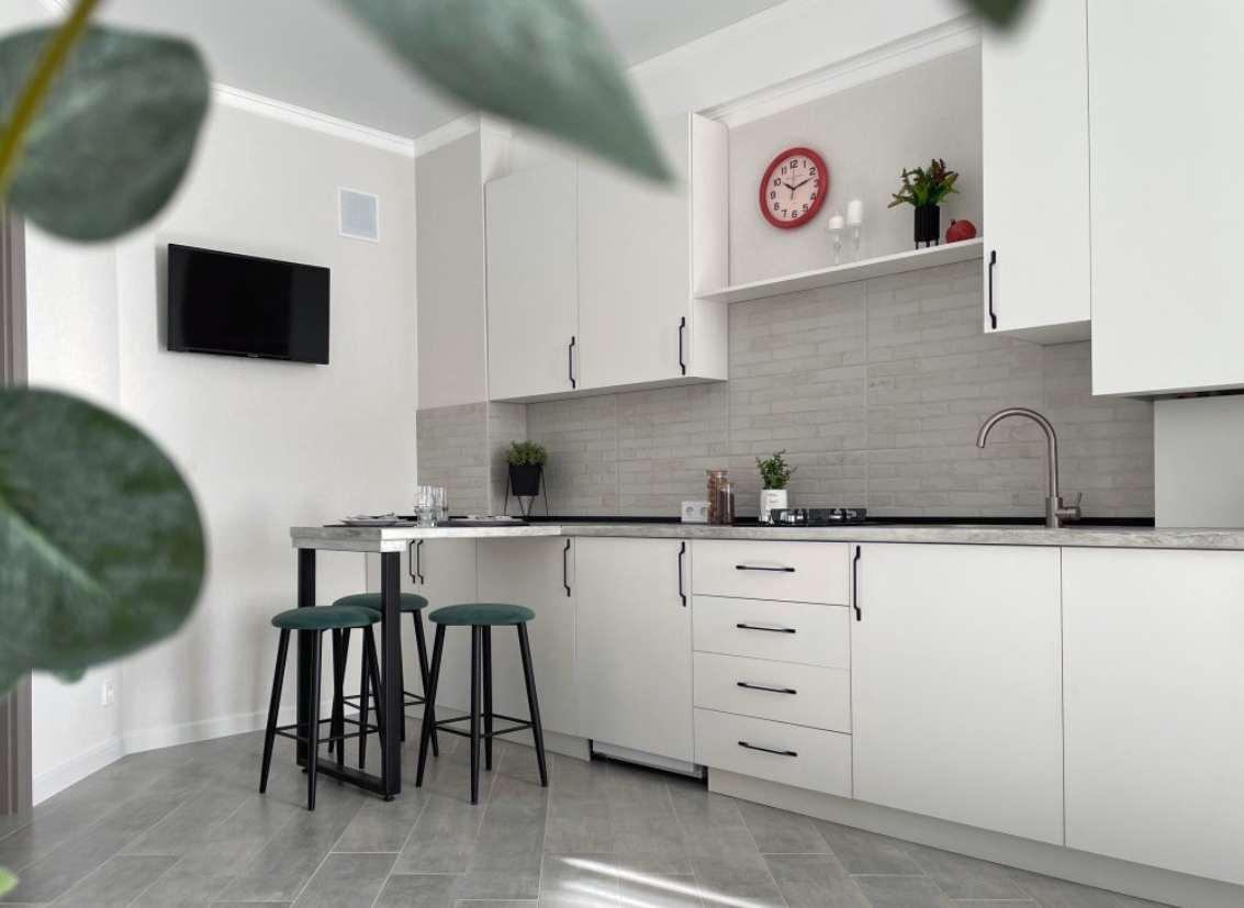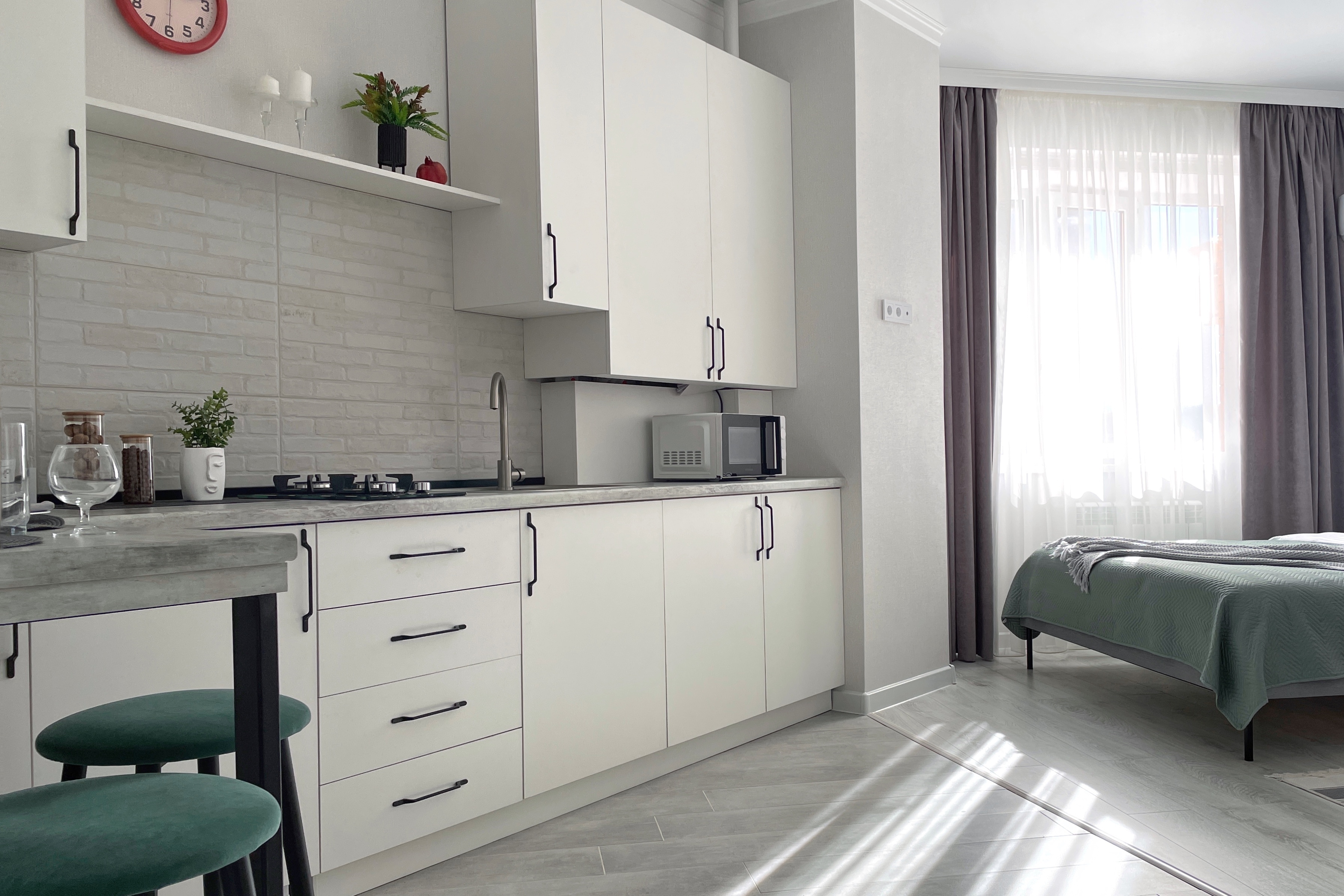 - Современная кухня с необходимой бытовой техникой: микроволновая печь, небольшой холодильник, газовая плита, чайник, кофеварка.