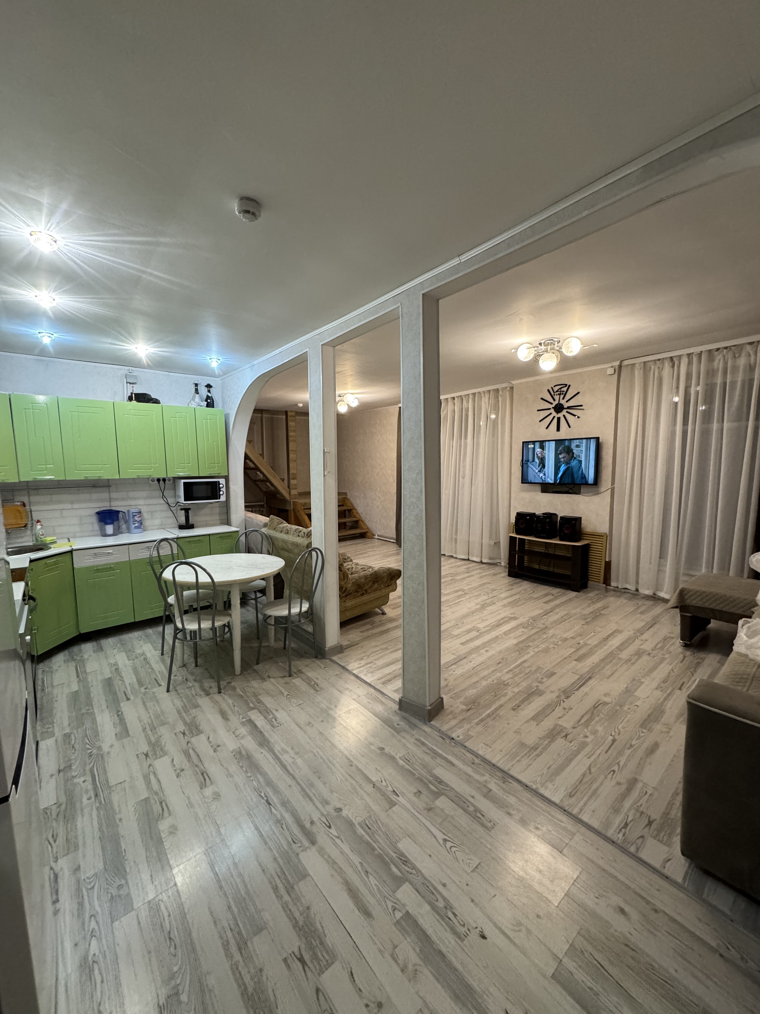 На первом этаже расположена большая кухня, объединенная с гостиной, где Вы сможете наслаждаться совместными трапезами и вечерними посиделками. Просторная кухня оборудована всей необходимой современной бытовой техникой: здесь есть электрическая плита, микроволновая печь и электрический чайник, что позволит Вам легко готовить любимые блюда. Также в наличии вся необходимая посуда, чтобы Вы могли накрыть стол для всей семьи.