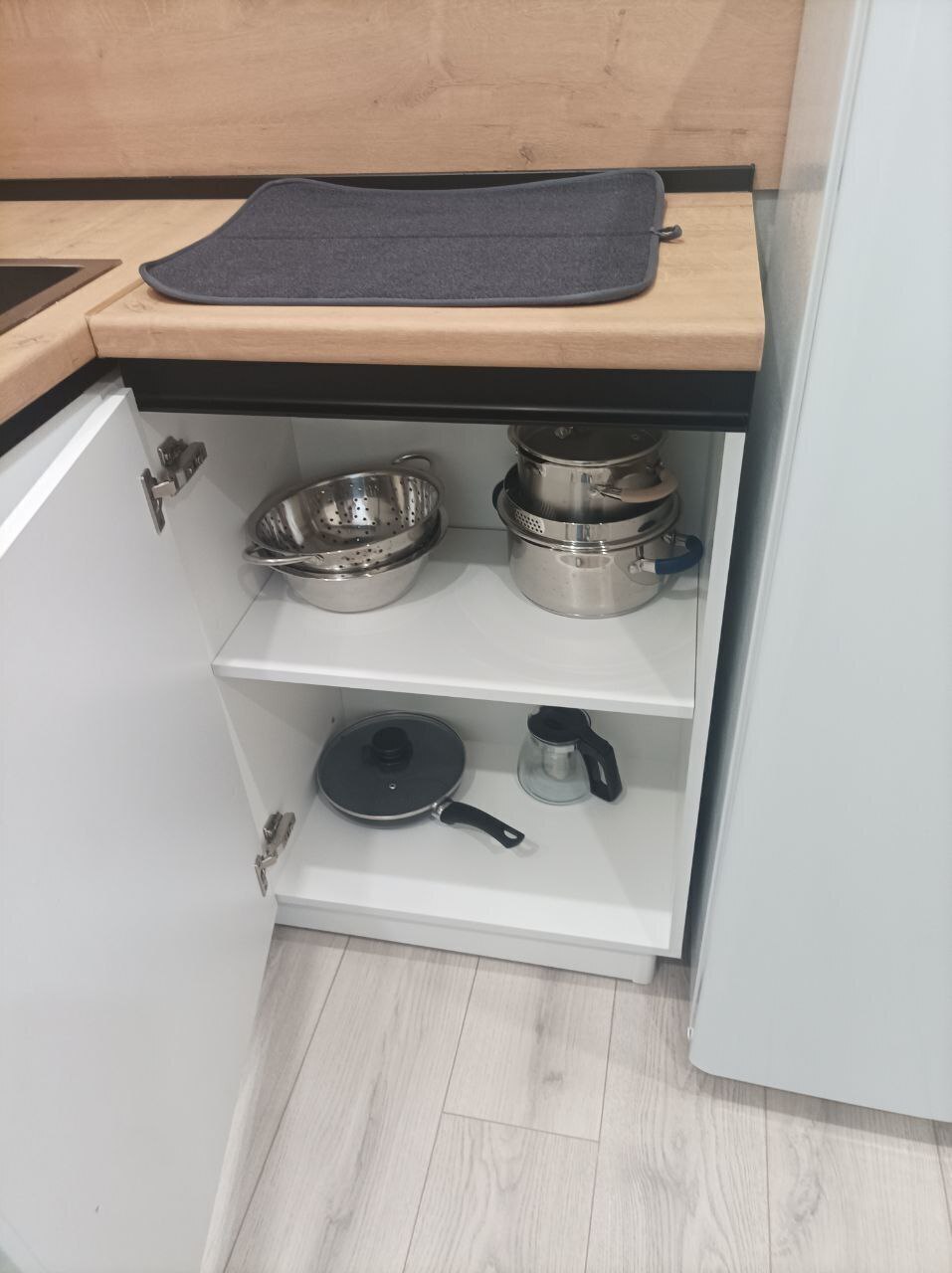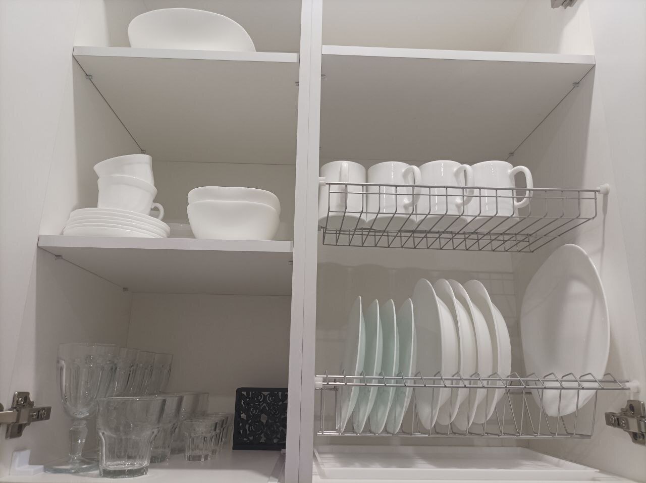 - всевозможные кухонные принадлежности (2 кастрюли разных диаметров, сковорода, 2 разделочные доски, терка, столовые приборы, стаканы, бокалы, рюмки);
