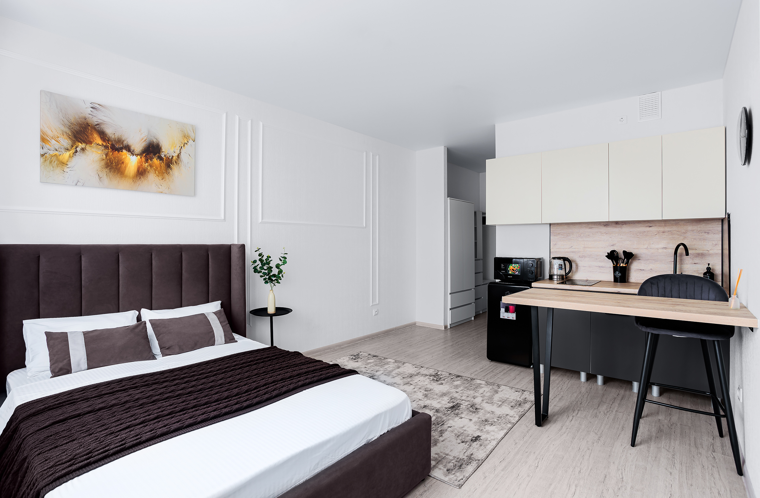 Современная мебель, посуда, бытовая техника. Заправленное постельное белье, полотенца, одноразовые губки, тряпочки. На кухне есть вся необходимая посуда для приготовления пищи.