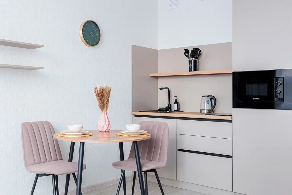 Современная мебель, посуда, бытовая техника. Заправленное постельное белье, полотенца, одноразовые губки, тряпочки. На кухне есть вся необходимая посуда для приготовления пищи.