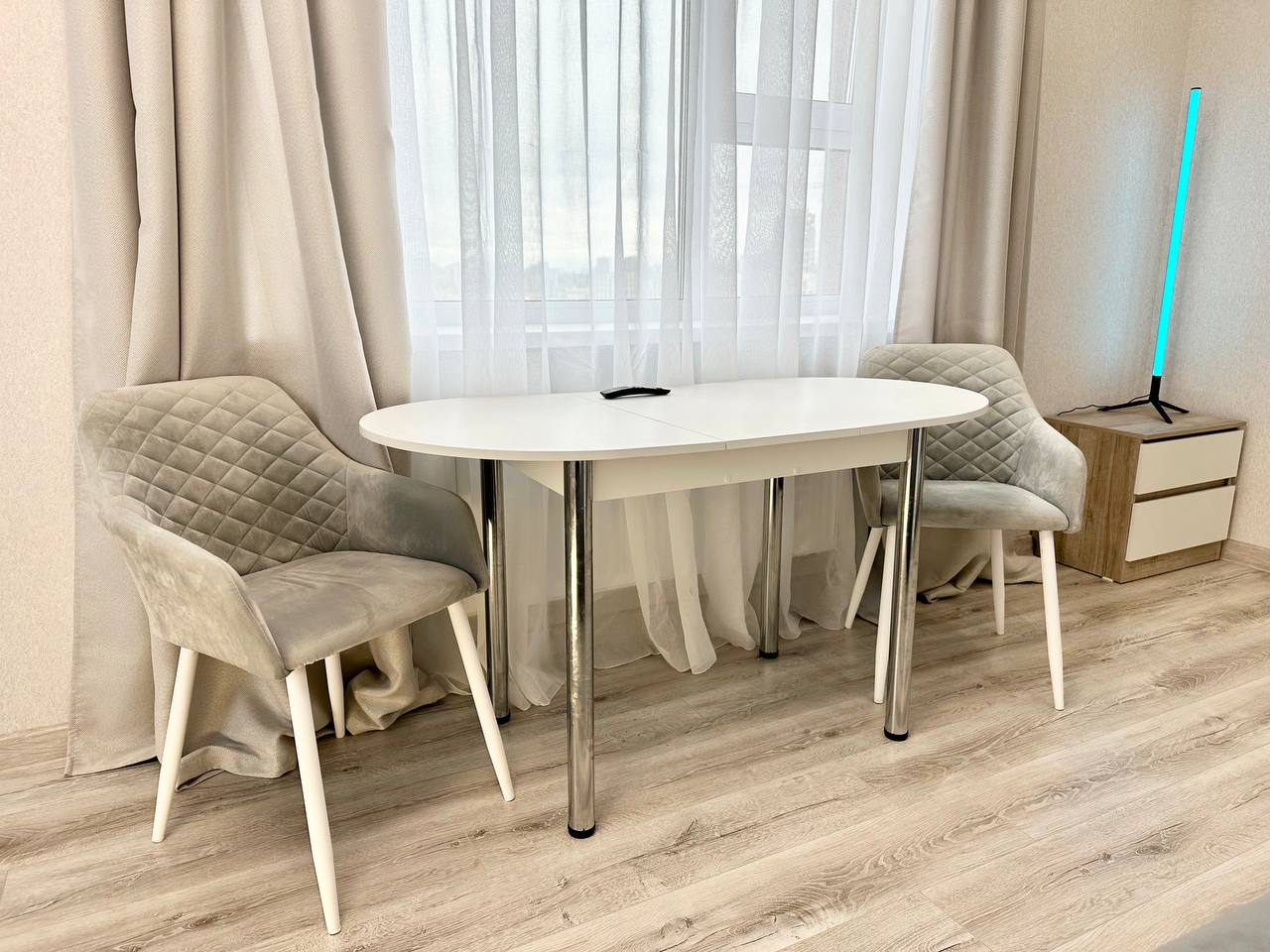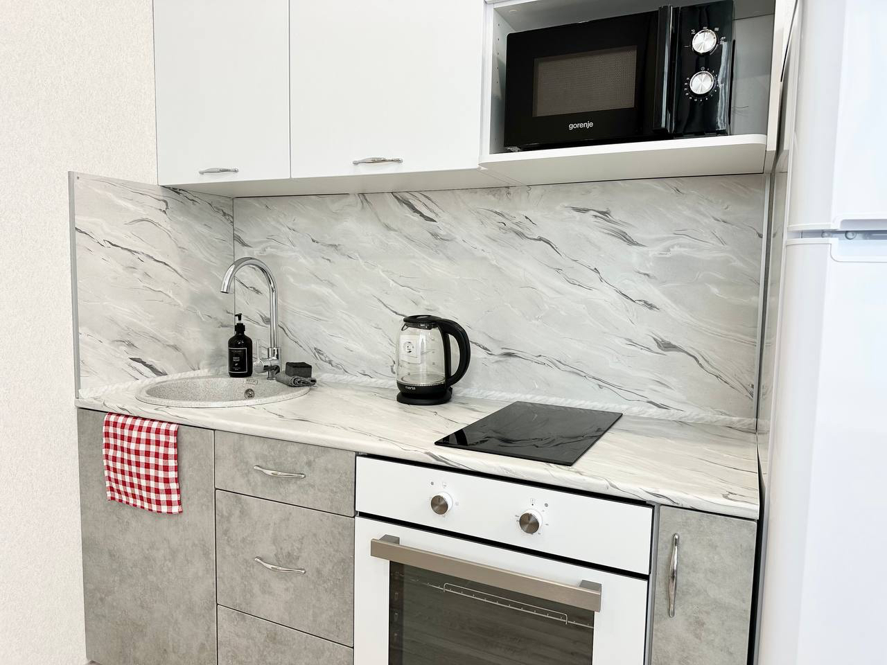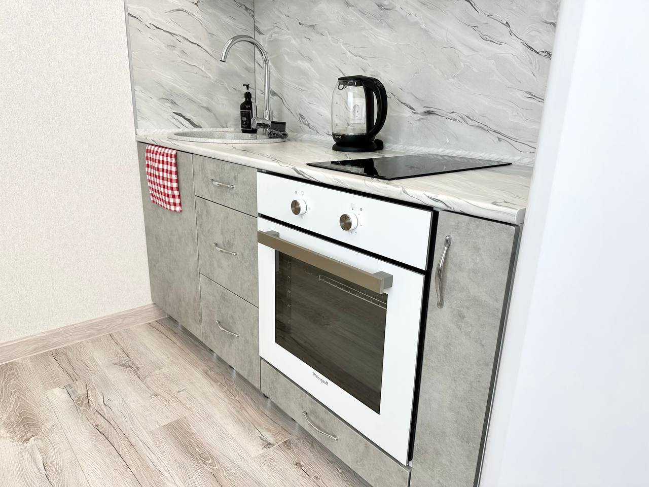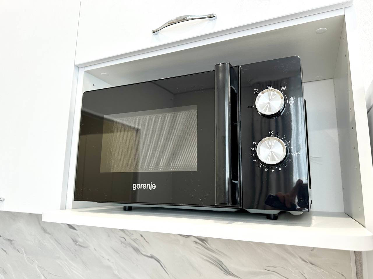 - Удобная обеденная и кухонная зона с набором посуды, плитой, микроволновой печью;