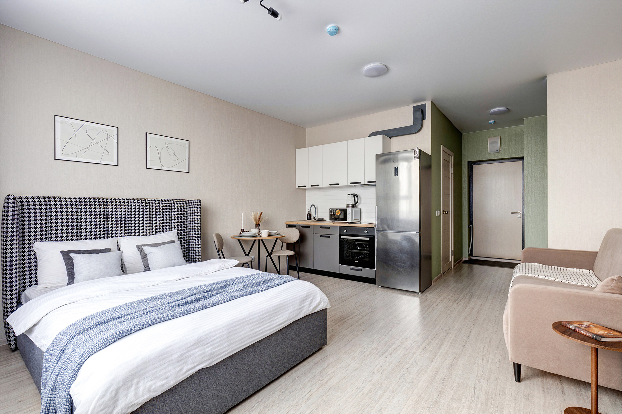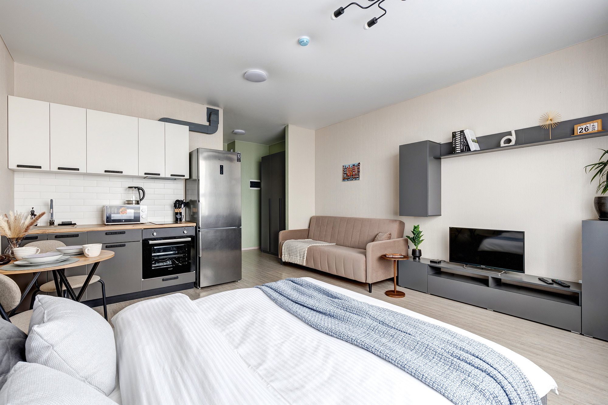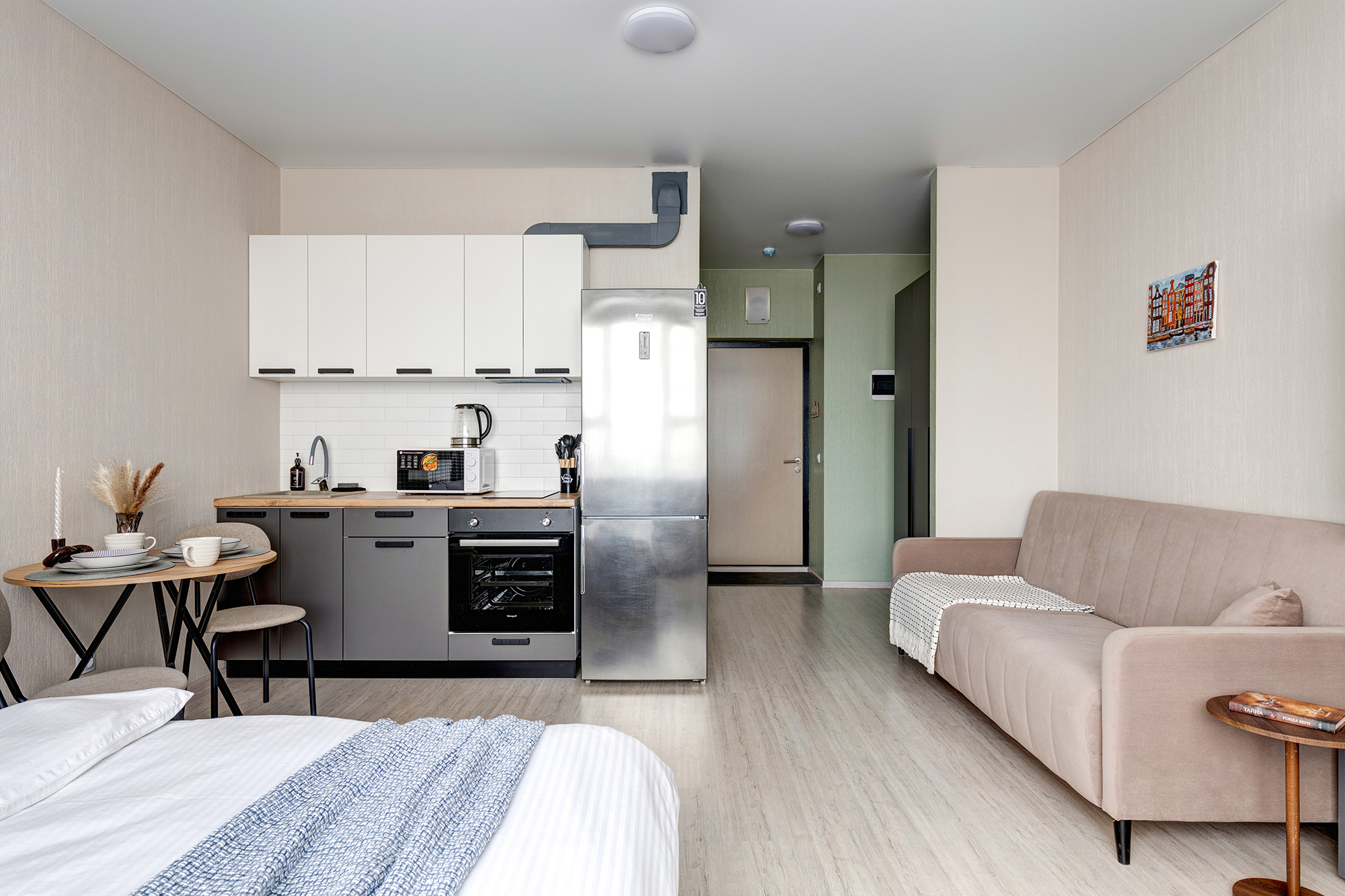 - Удобная обеденная и кухонная зона с набором посуды, плитой, микроволновой печью;