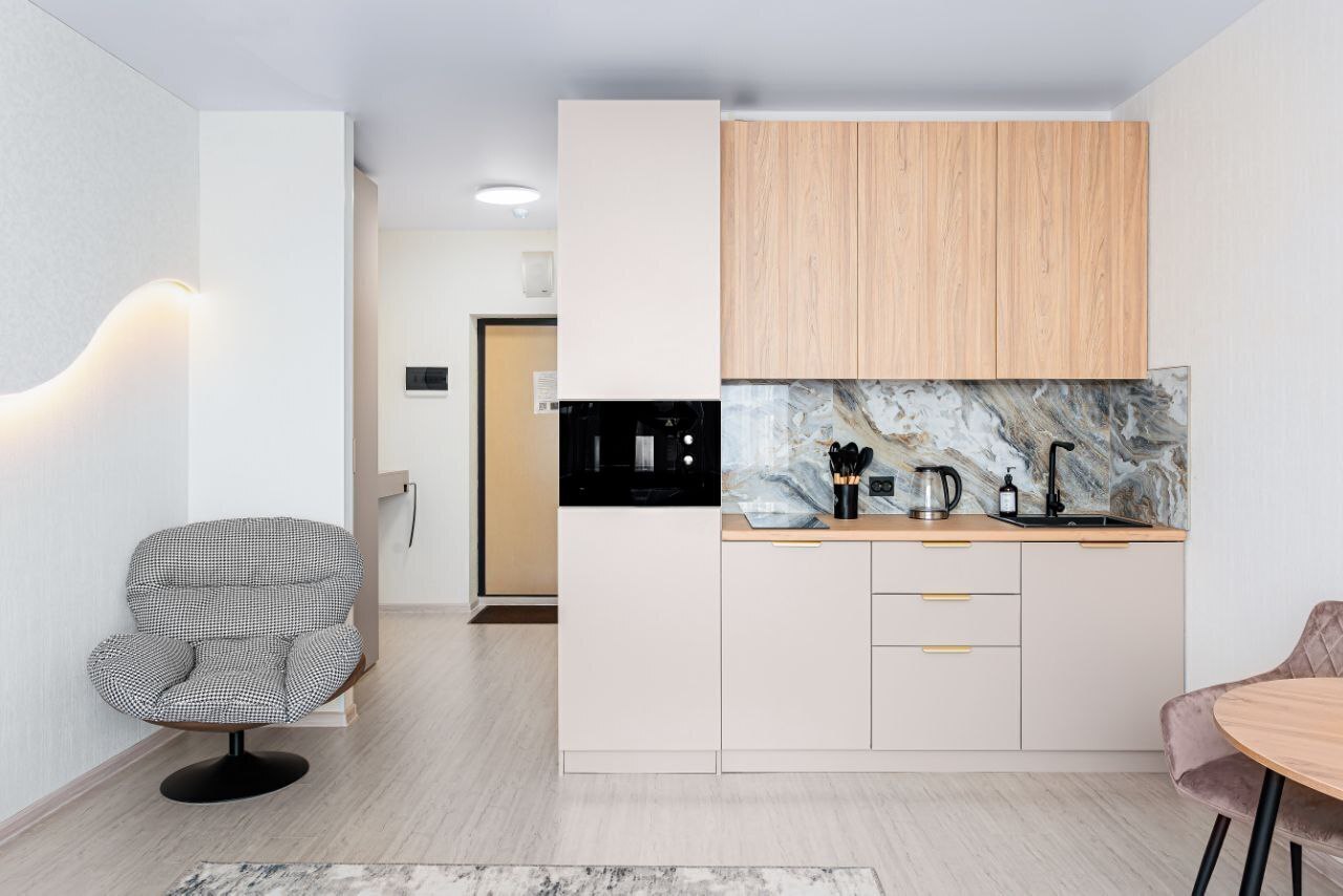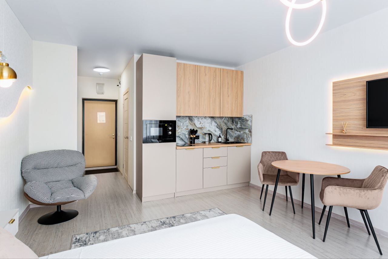 - Удобная обеденная и кухонная зона с набором посуды, плитой, микроволновой печью;