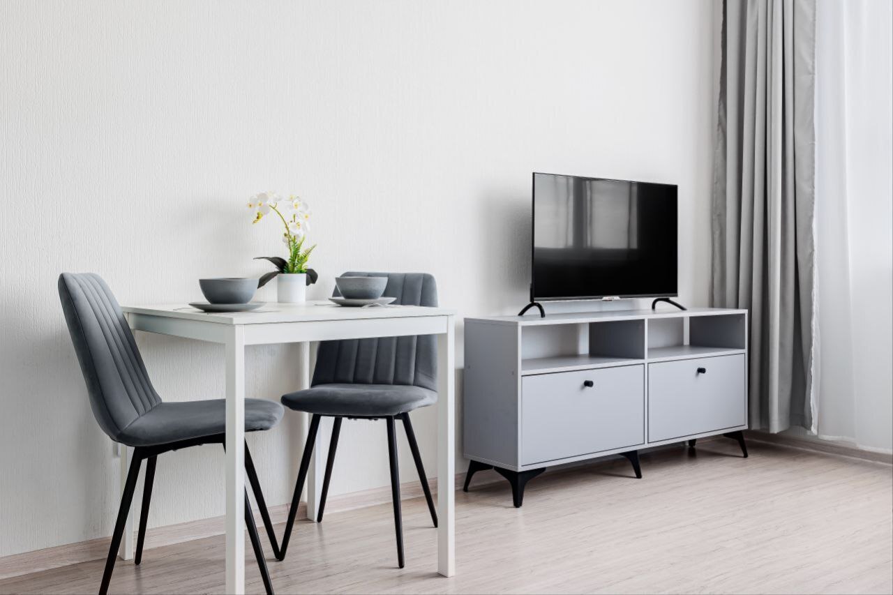 - Удобная обеденная и кухонная зона с набором посуды, плитой, микроволновой печью;