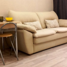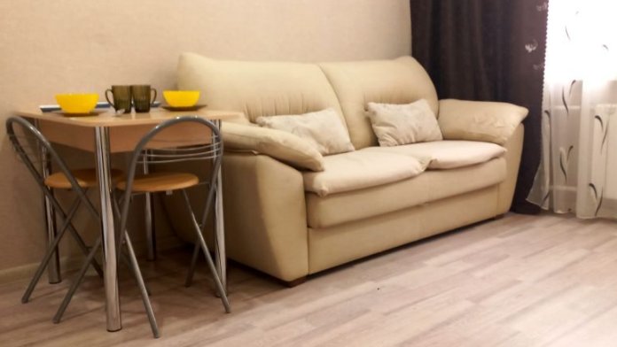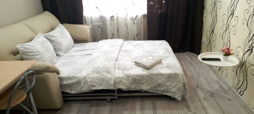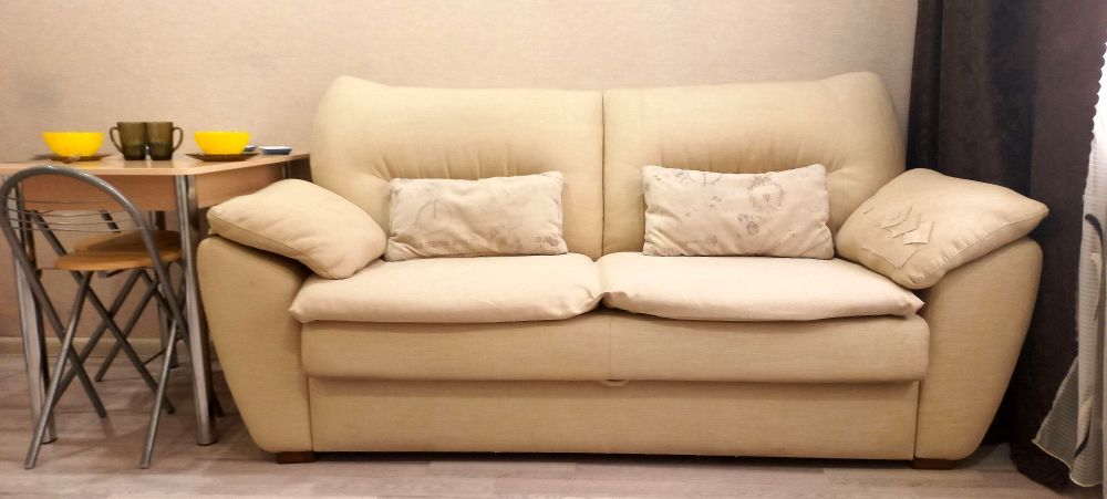 В студии, диван раскладной. На диване могут разместиться 2 человека.