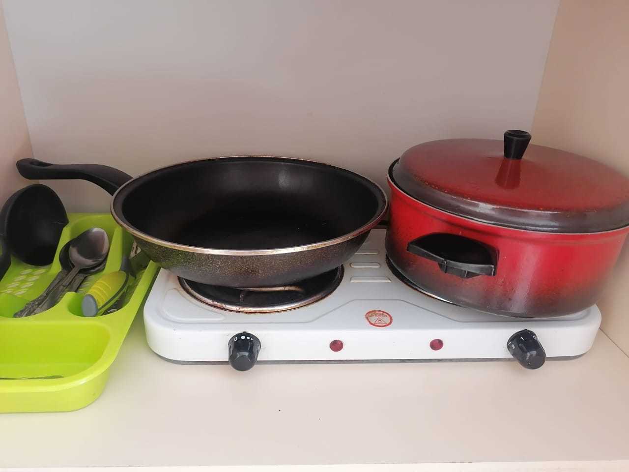Вся необходимая бытовая техника:холодильник, св печь, Эл. плита, чайник, ( средства личной гигиены)