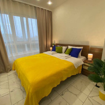 В квартире: спальня и отдельно кухня. 1 двуспальная кровать + 1 раскладной диван. Для Вас готово свежее постельное бельё (100%-й хлопок) и полотенца. В квартире есть большая ванна и балкон.
