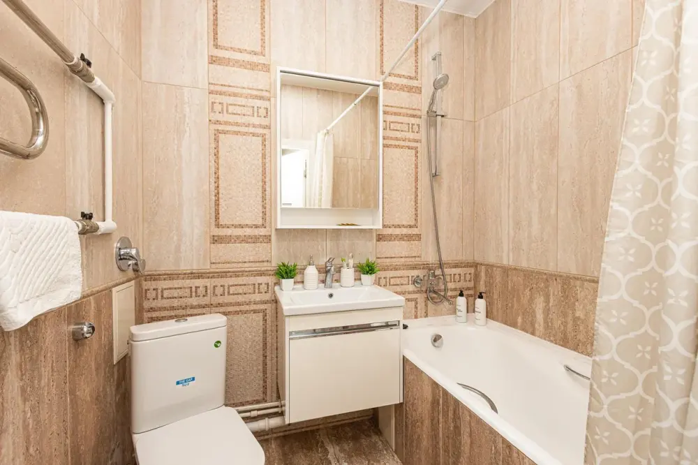 Техника: холодильник, чайник, плита, микроволновка, стиральная машина, утюг, фен. Есть всё для приготовления еды, а также сушилка и гладильная доска.