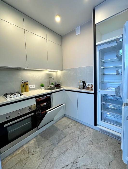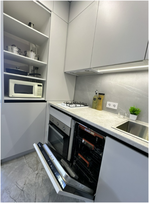 - Кухня оборудована холодильником, посудомоечной машиной, микроволновой печью, чайником и варочной поверхностью.