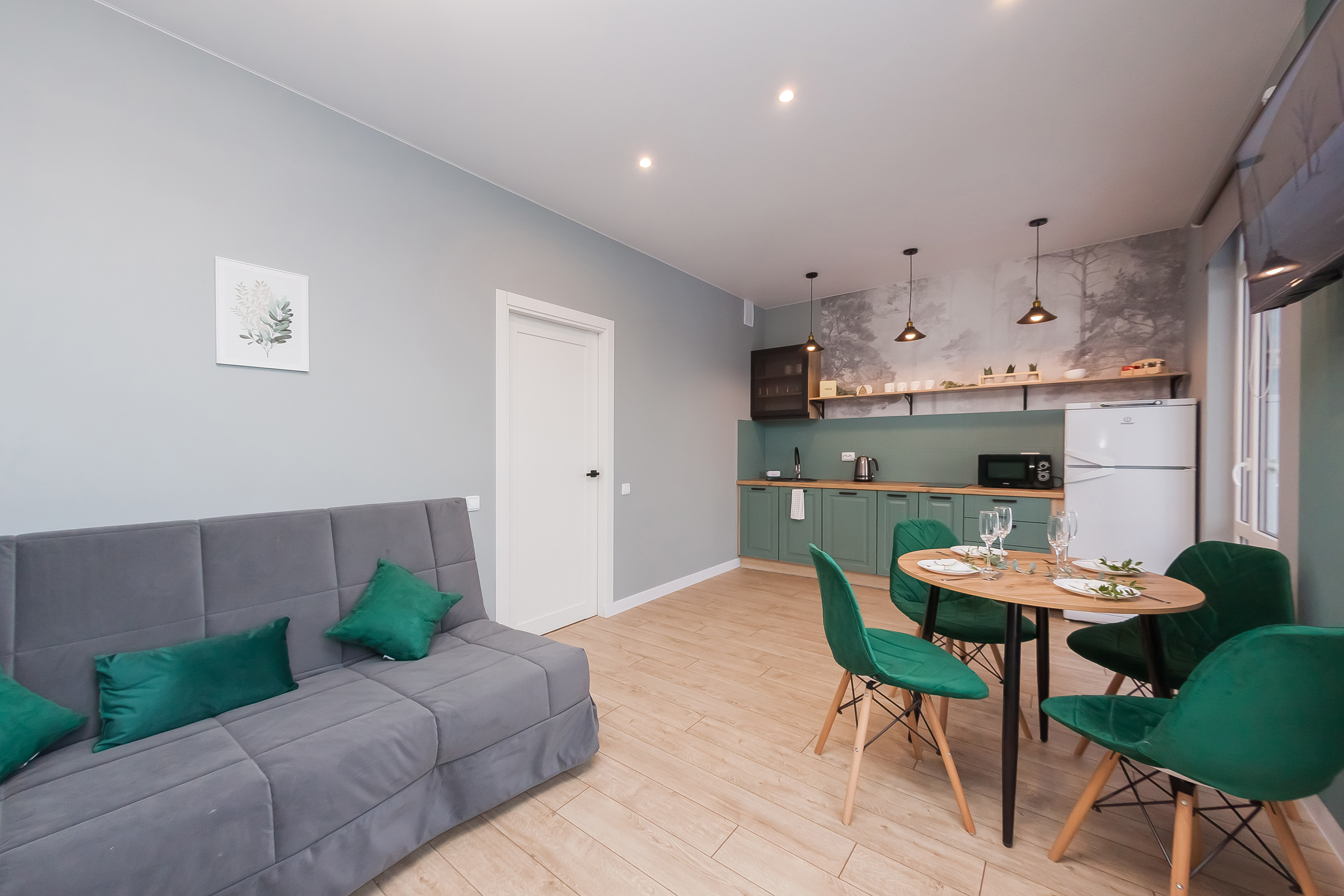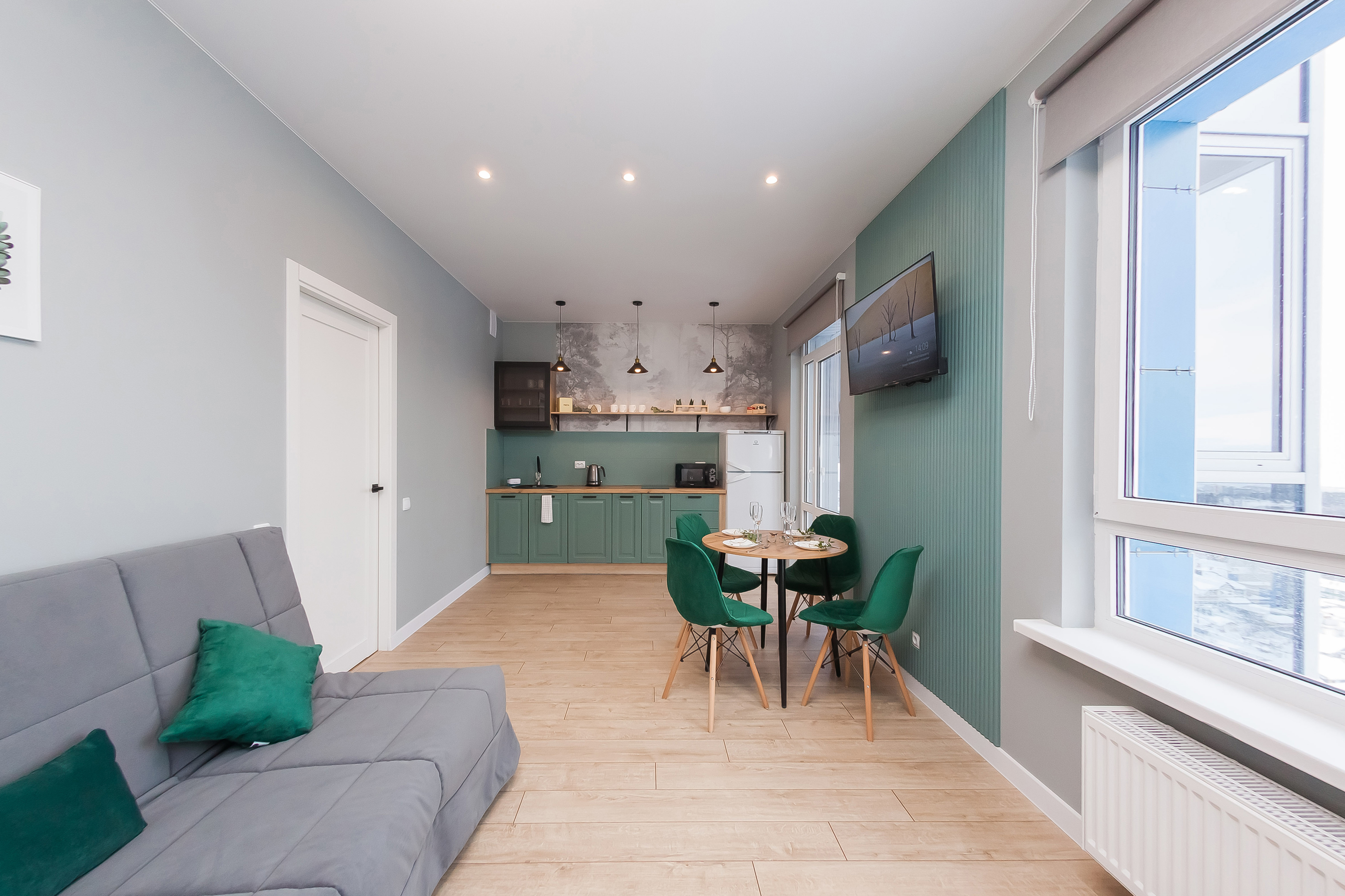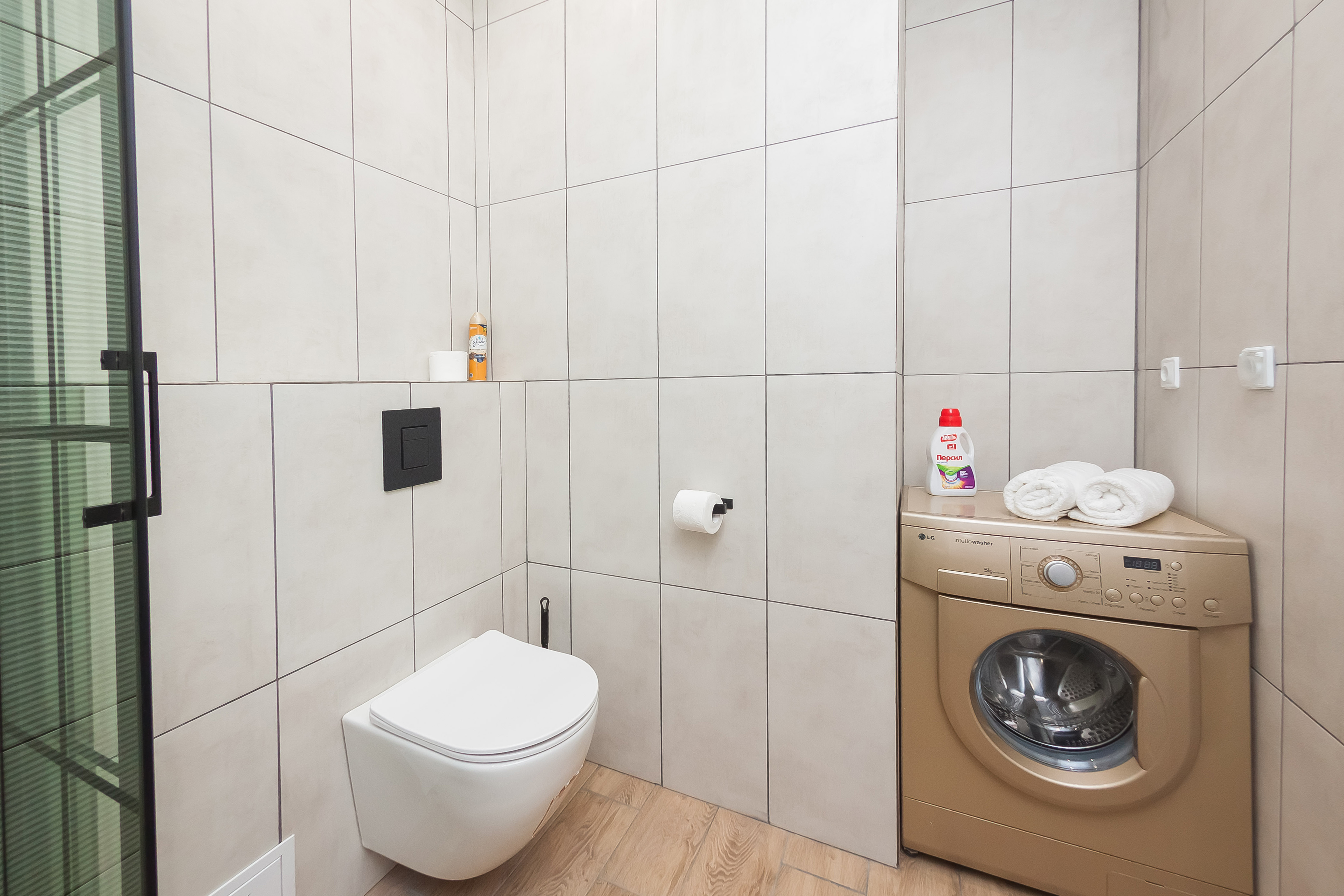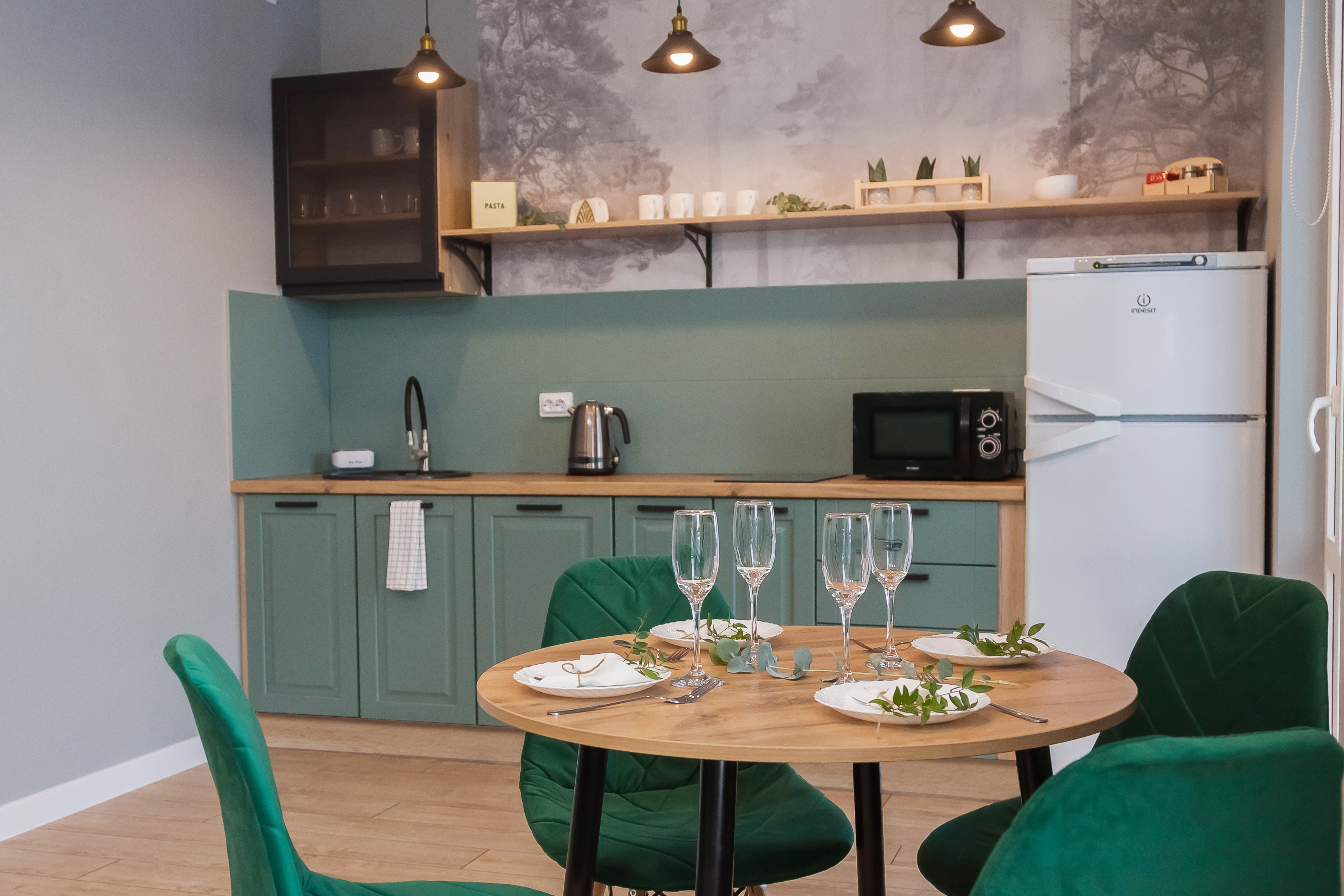- Полная оборудованность: всё для жизни как дома - от быстрой стиральной машины и Wi-Fi до полностью укомплектованной кухонной зоны (посуда, холодильник, варочная поверхность для готовки, чайник, чай и кофе).