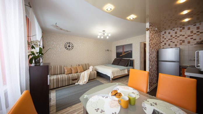 - 2 комфортных спальных места, которые позволят разместить до 4-х гостей (большая мягкая кровать и удобный раскладной диван).