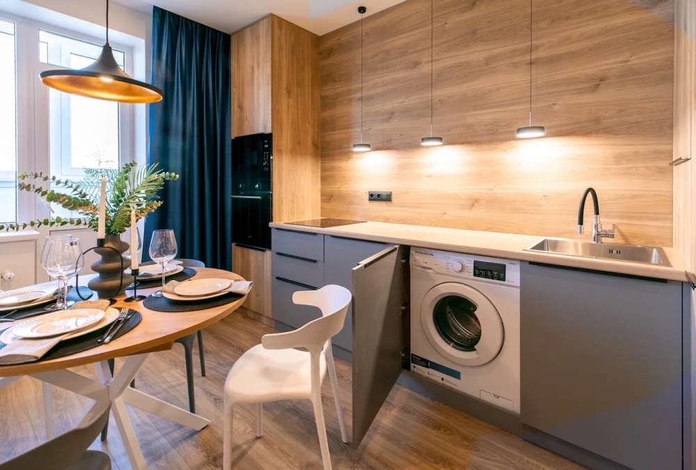 Полностью оборудованная кухня с профессиональной техникой и изысканной посудой.