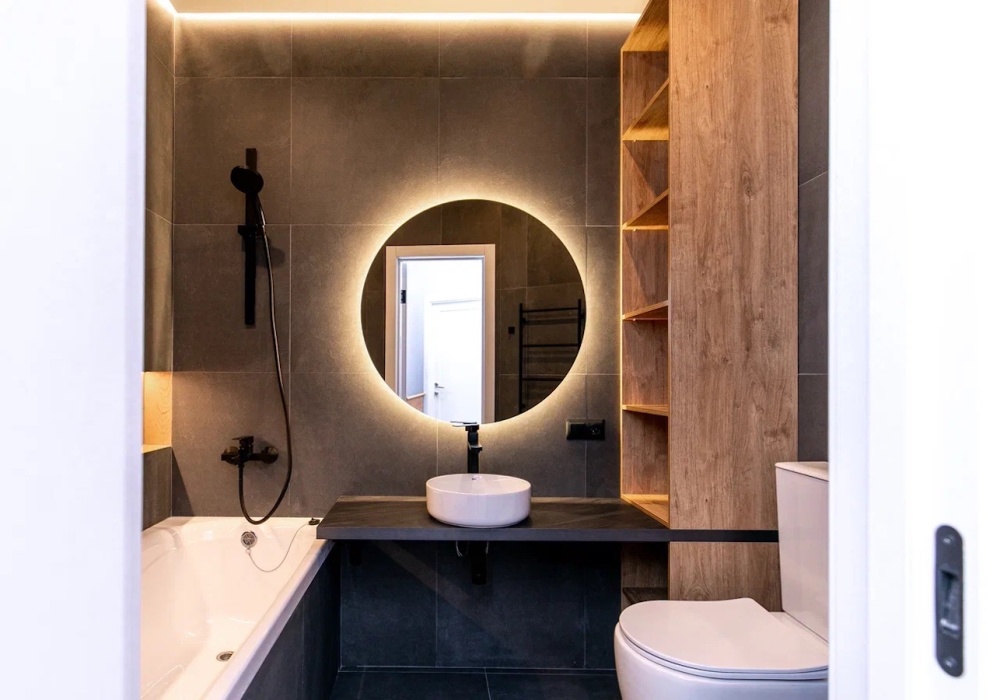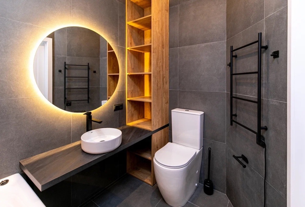 Современная ванная комната с эксклюзивными косметическими принадлежностями.