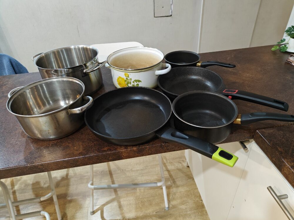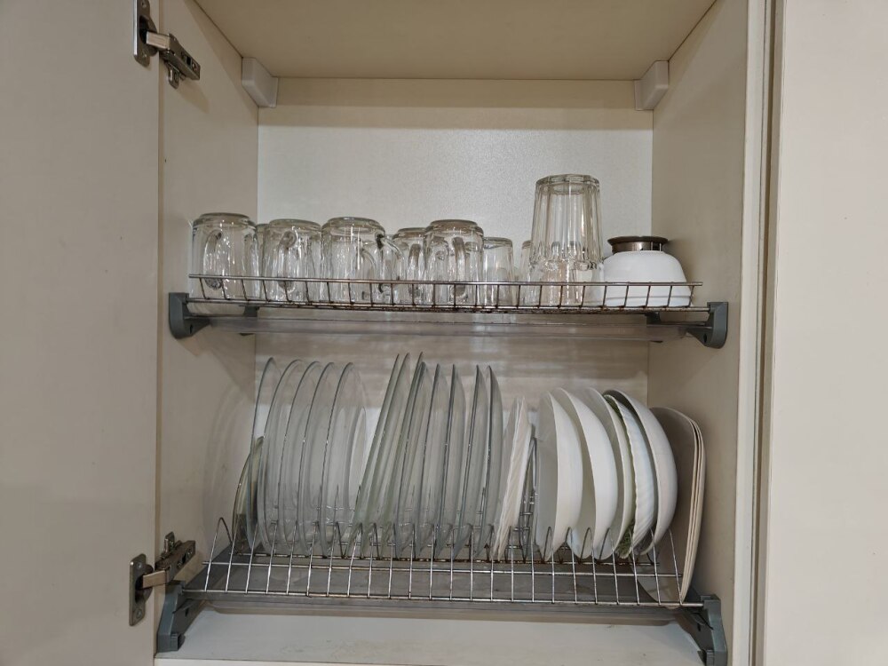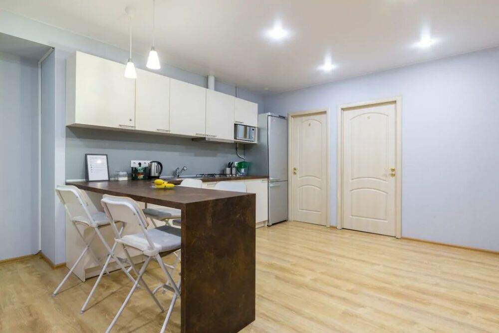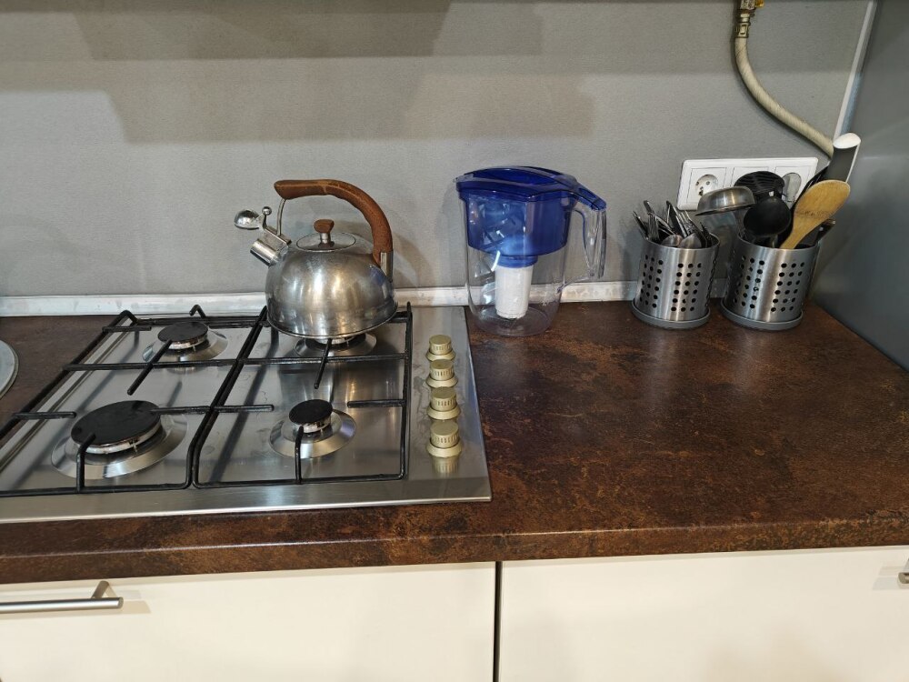 Просторная кухня оснащена всем необходимым для комфортного пребывания: холодильником, плитой, микроволновой печью, кухонными принадлежностями, посудой, электрическим чайником и стиральной машиной.