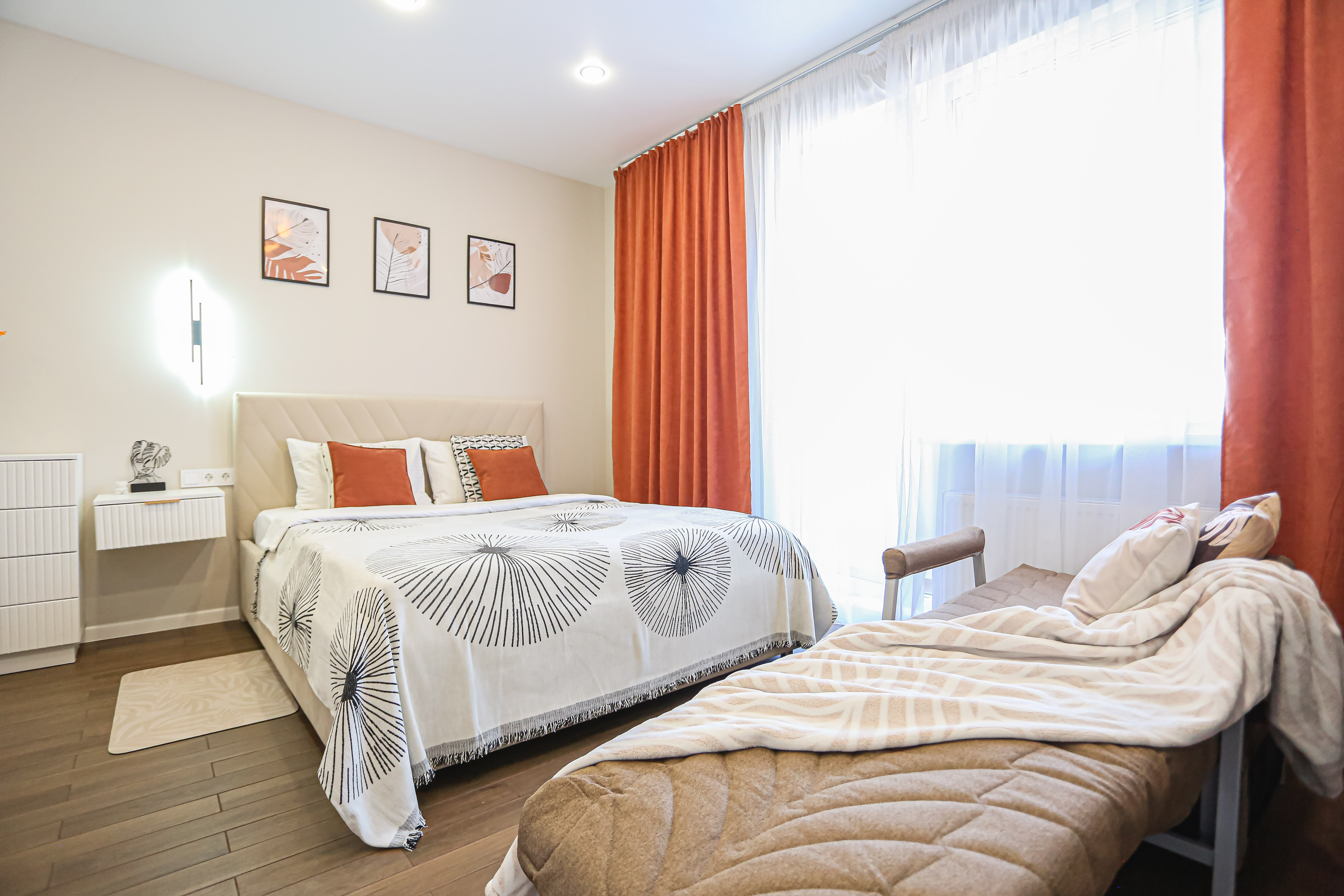Размещение 3 человека: 2-спальная кровать 160х200 с ортопедическим матрасом, кресло - кровать, для ребенка или стройного взрослого, чистое и свежее хлопоковое бельё.