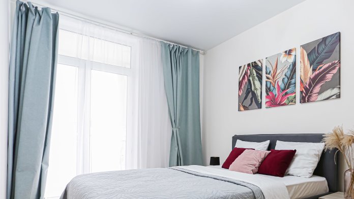Кровать с ортопедическим матрасом и шторы блек - аут помогают прекрасно выспаться и отдохнуть.