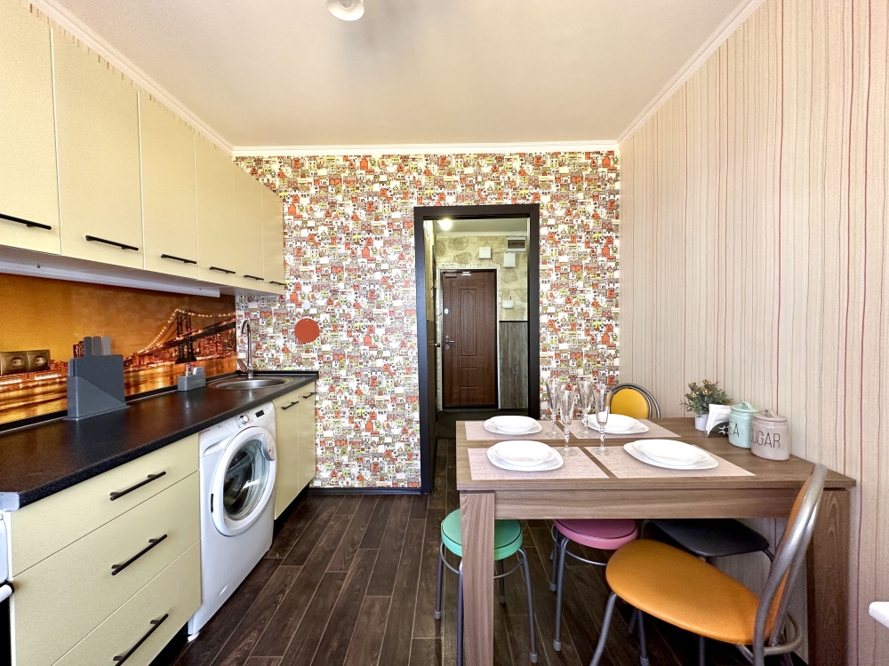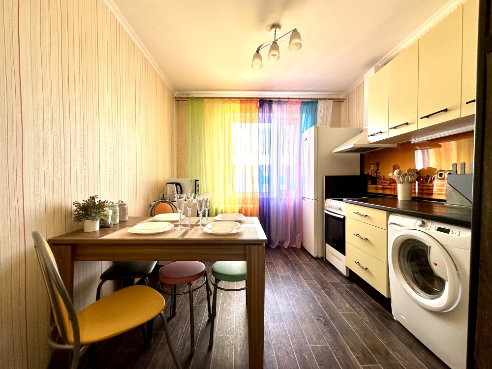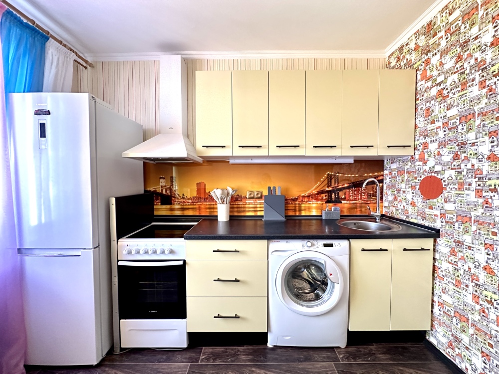 - современная бытовая техника: электрическая плита, вытяжка, двухкамерный холодильник, электрочайник, свч, фен, утюг, стиральная машина.
