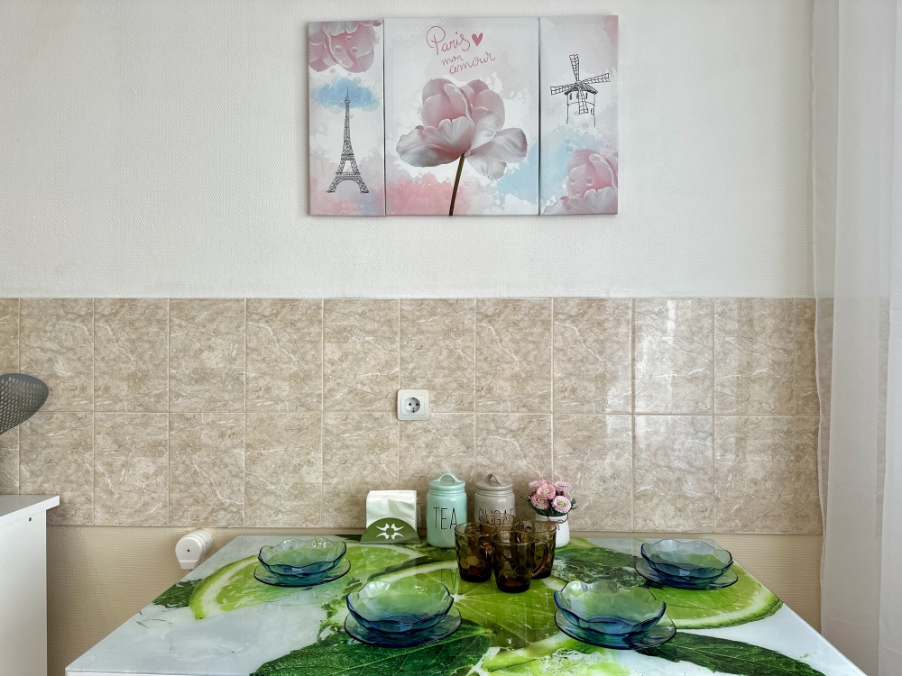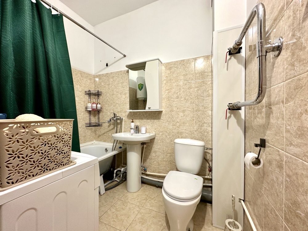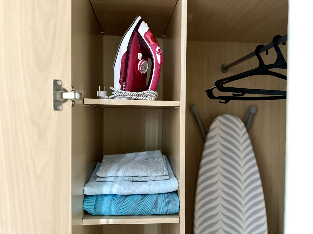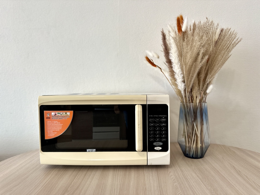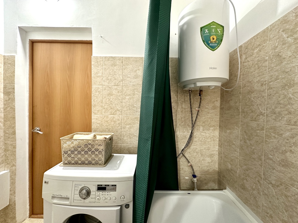 - современная бытовая техника: электрическая плита, вытяжка, двухкамерный холодильник, электрочайник, свч, фен, утюг, стиральная машина.