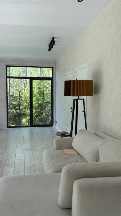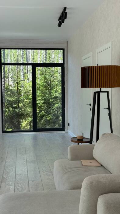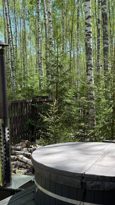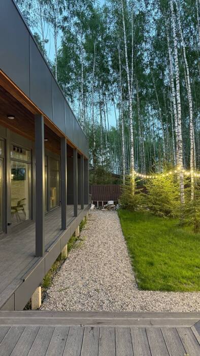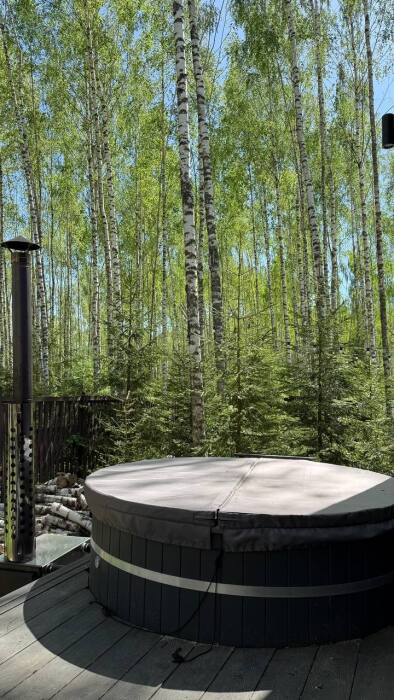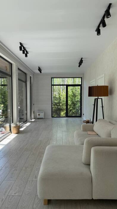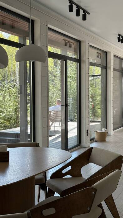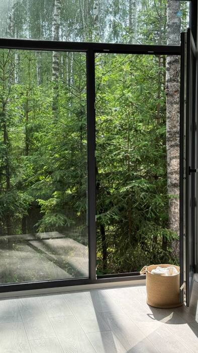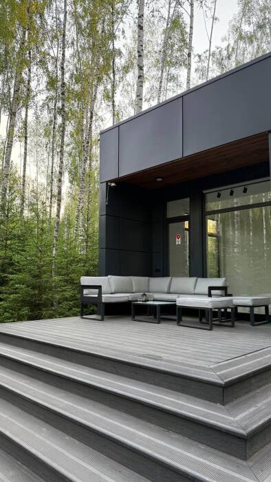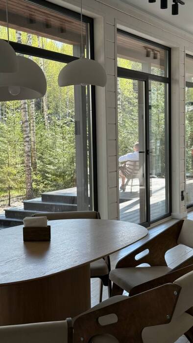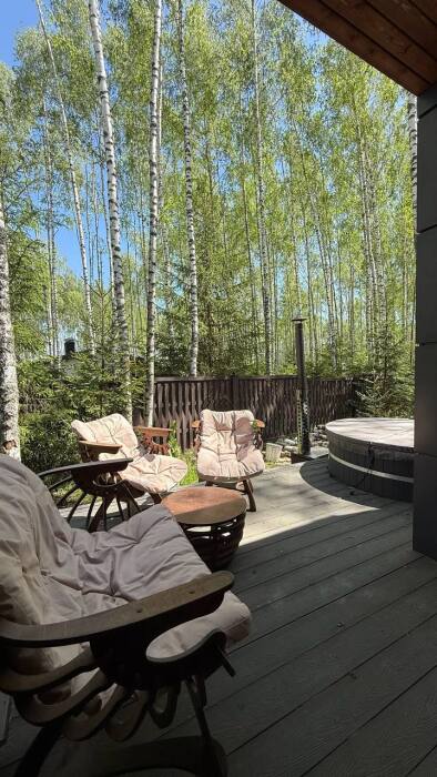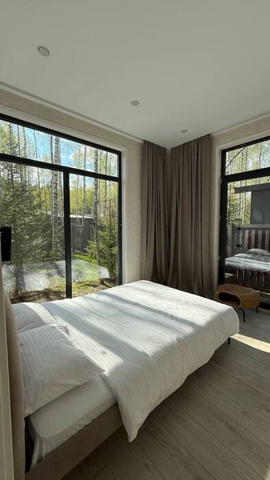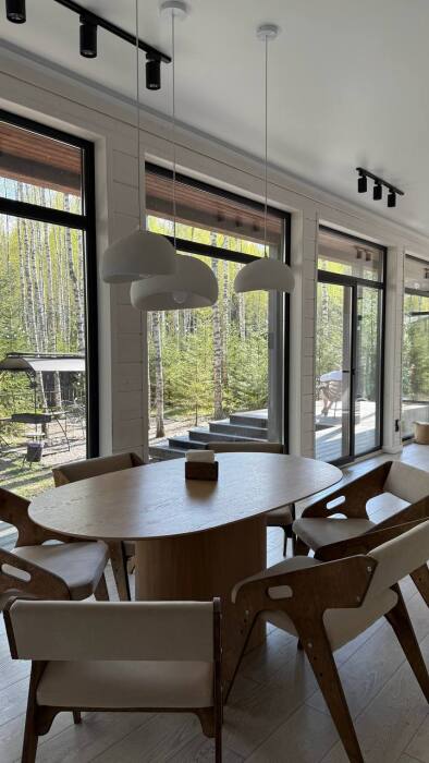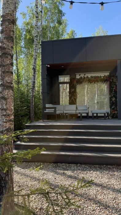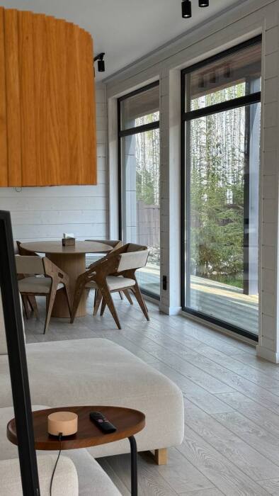 Стильный дом на лесном участке с панорамной сауной и горячим чаном
