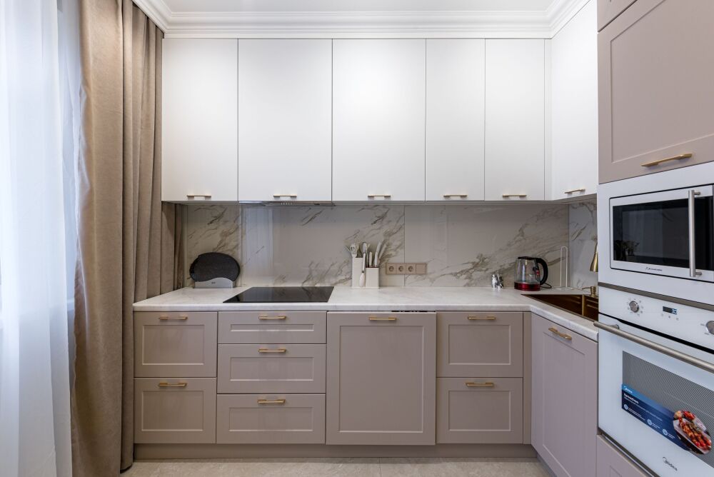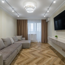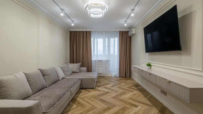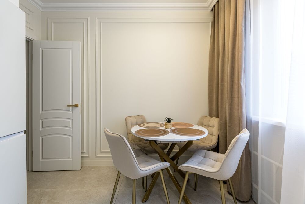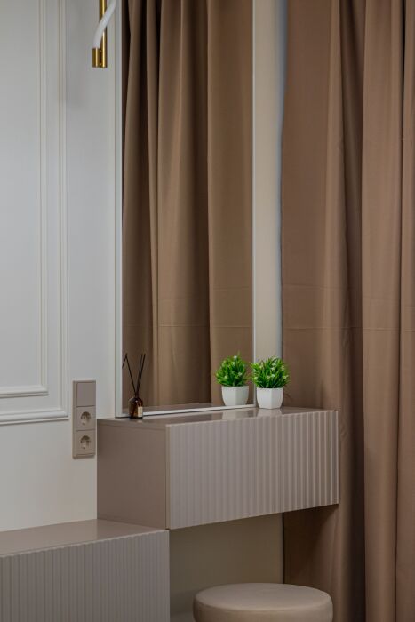 Элегантный интерьер выполнен в бежево-песочной гамме с элементами классики и современного дизайна. Квартира идеально подойдёт для комфортного размещения до 4 гостей.