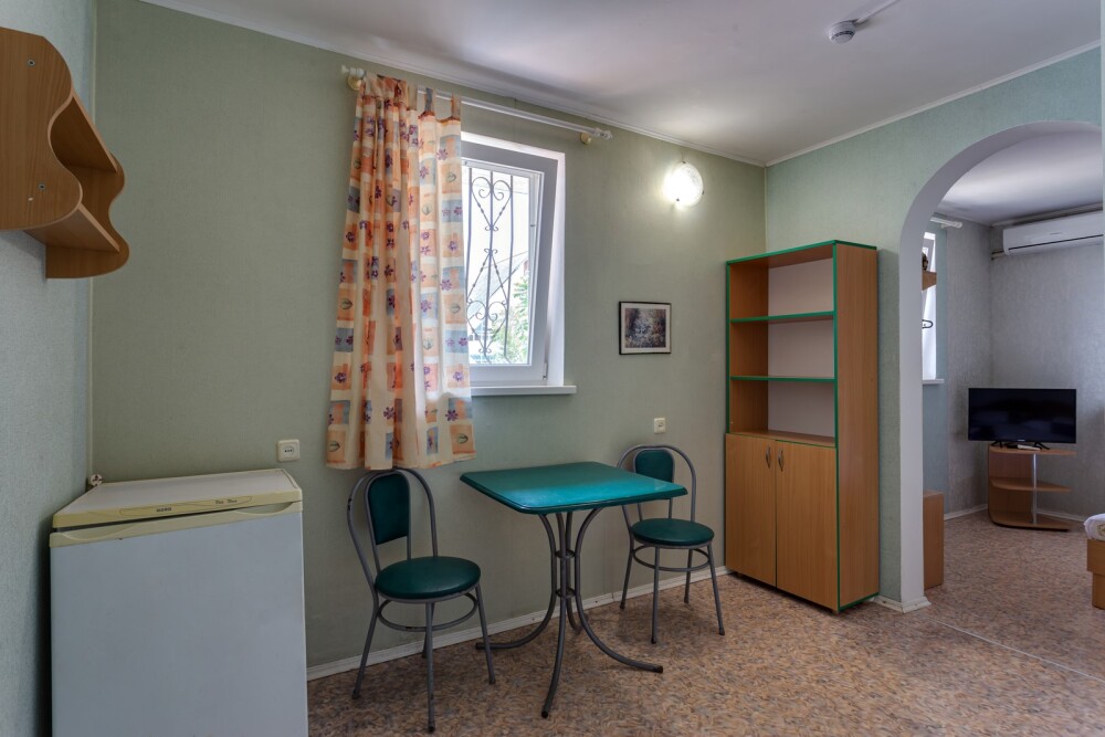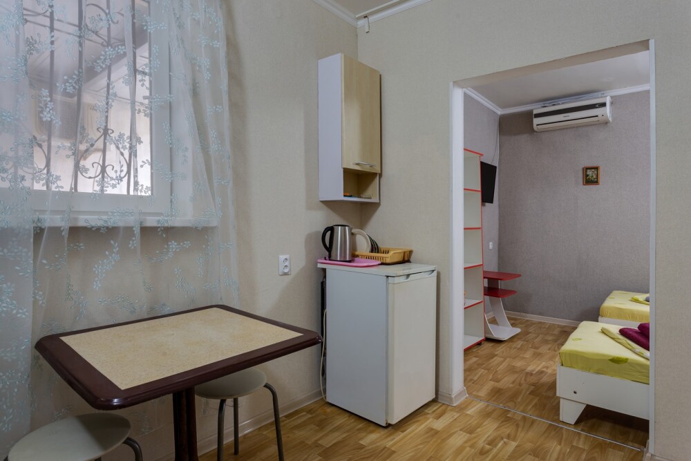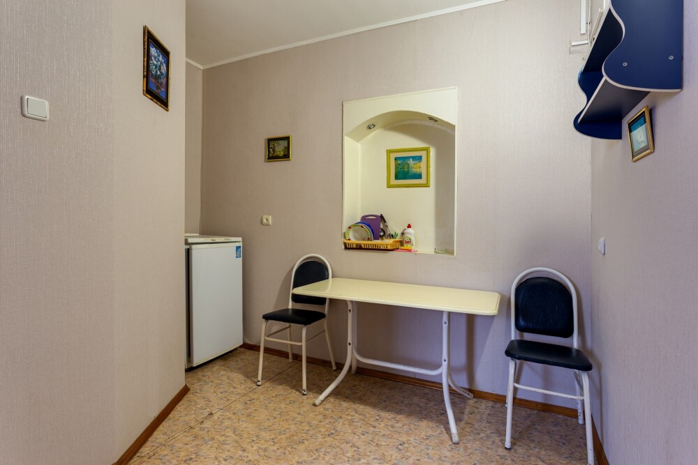 В первой комнате: стол, стулья, посуда (тарелки и чашки) на 2 человека, холодильник, электрочайник.