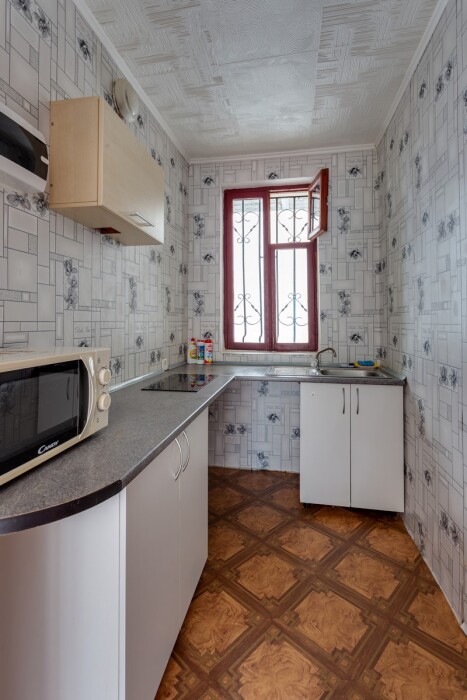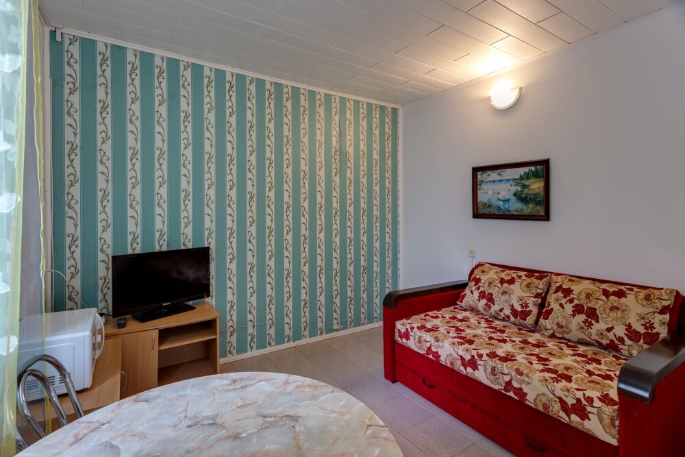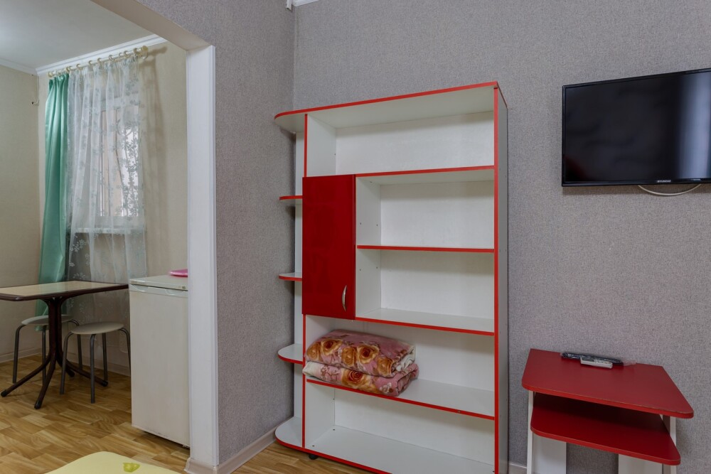 В первой комнате: диван, стол, стулья, посуда (тарелки и чашки) , шкафчики, телевизор, микроволновка, электрочайник.