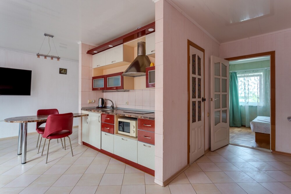 Две спальни с большими шкафами и двуспальные кроватями, двуспальный угловой диваном, полноценная кухня с посудой, холодильник, кондиционер, телевизор (спутниковое ТВ), огромная лоджия.