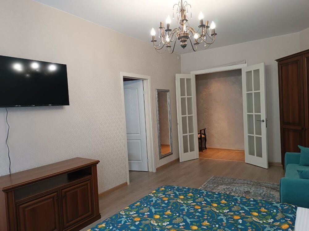 Вторая комната-гостиная - 30 метров - проходная. В комнате большая кровать 180*200 и раскладной односпальный 120*200 диванчик, шкаф, ТВ, комод.