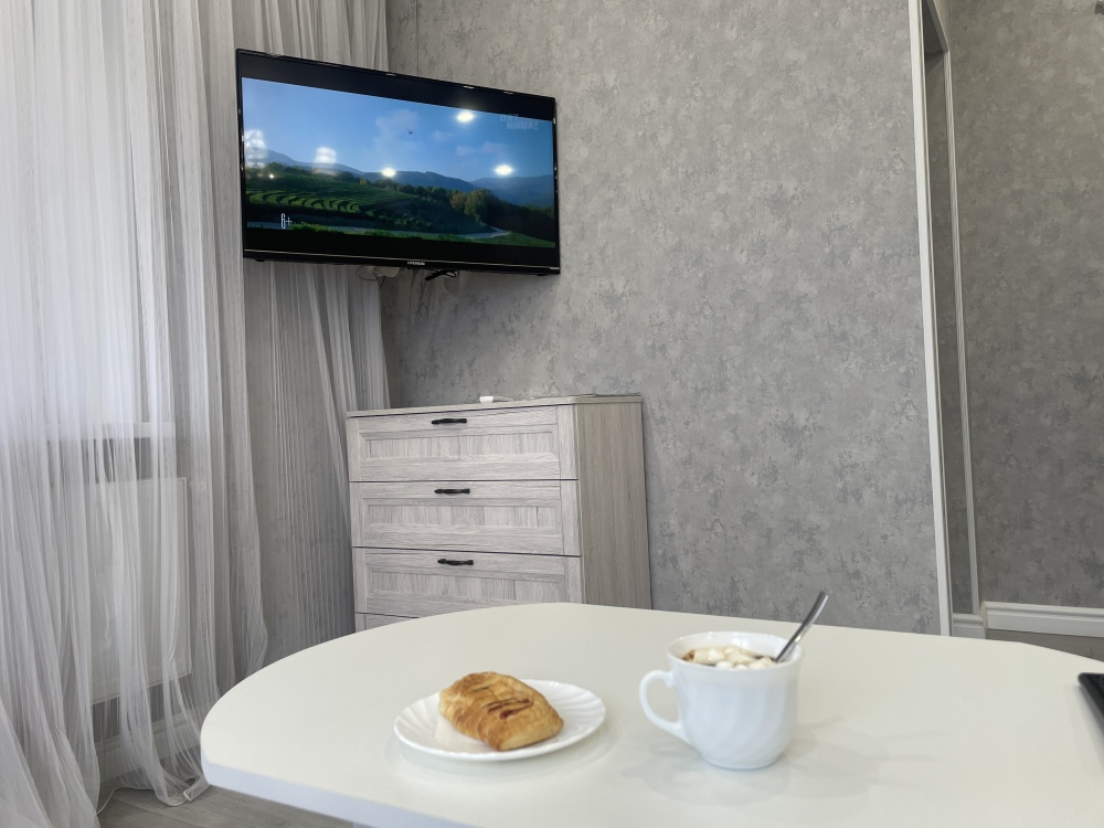 - чистая уютная однокомнатная квартира с балконом и видом на парк и гору Бештау, со всем необходимым для комфортного проживания (широкая двухспальная кровать 160×200; раскладывающийся диван; подушки и одеяла; посуда, средства гигиены, одноразовые тапочки, халаты, полотенца и т.д.);
