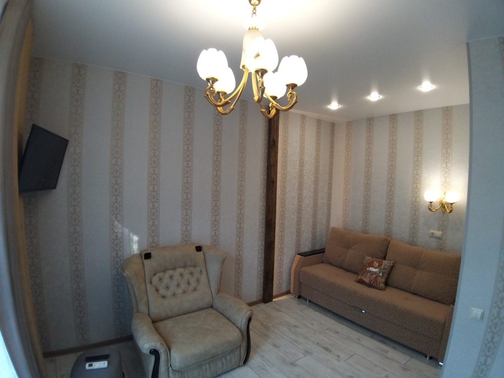 На 1 этаже - кухня-гостиная с 2-спальным диваном, совмещенный санузел и спальня (кровати раздвижные, можно соединить в двуспальную).