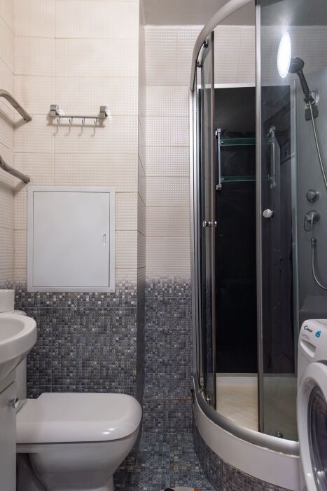 - современный санузел с душевой кабиной, стиральной машиной и косметическими наборами.