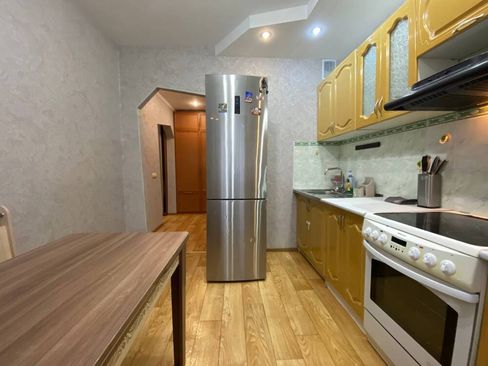 - Кухня с холодильником, варочной панелью, микроволновой печью, вытяжкой для готовки.