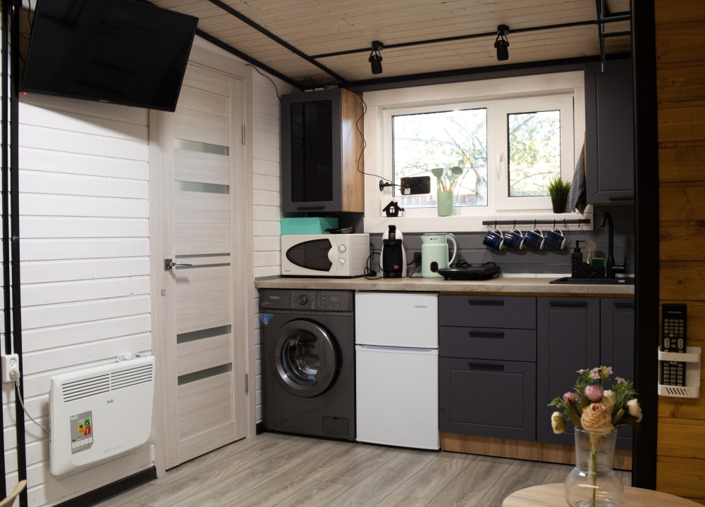Здесь есть всё необходимое для приготовления пищи: плита с одной конфоркой, микроволновая печь, чайник, кофемашина Dolce Gusto, холодильник с морозильной камерой.