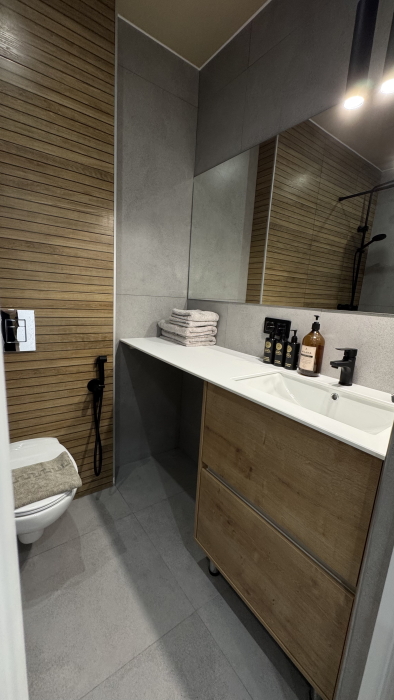 - Просторная студия (27 м²) с современной мебелью и стильным интерьером.