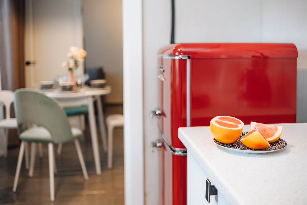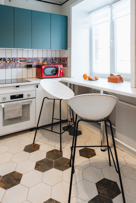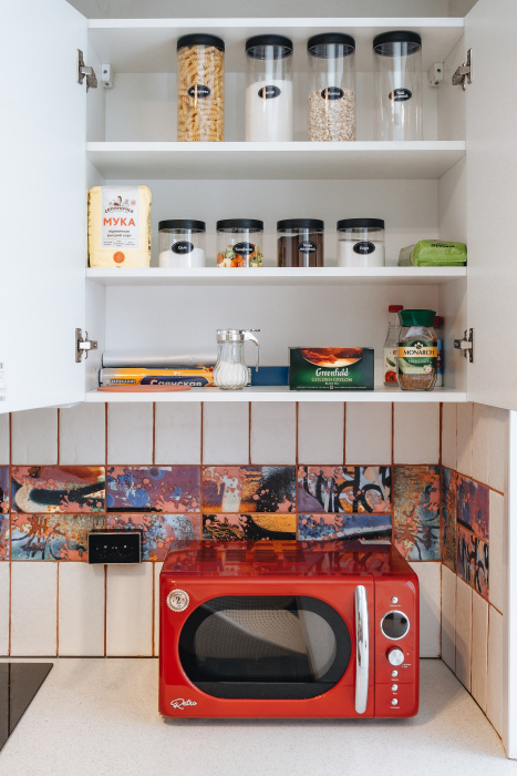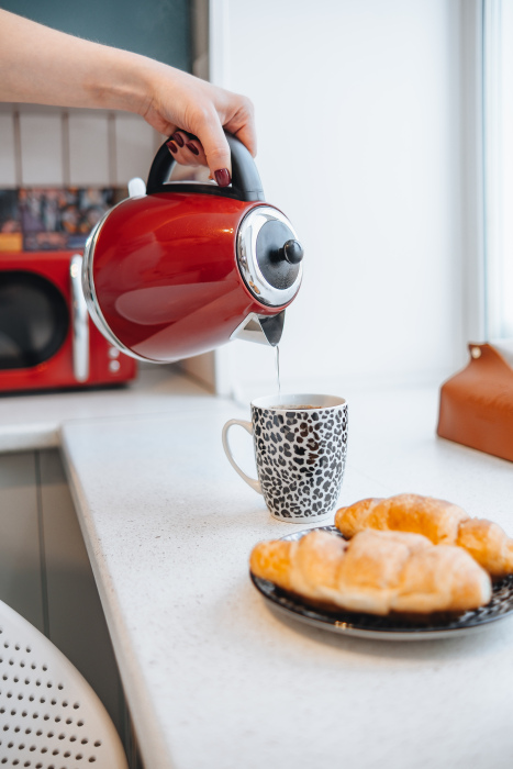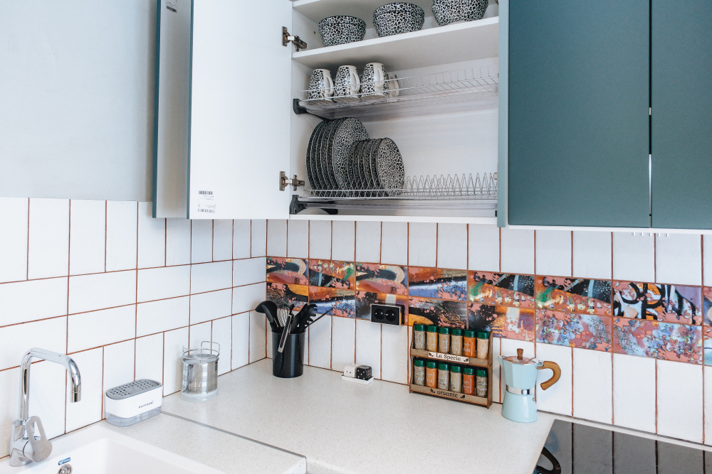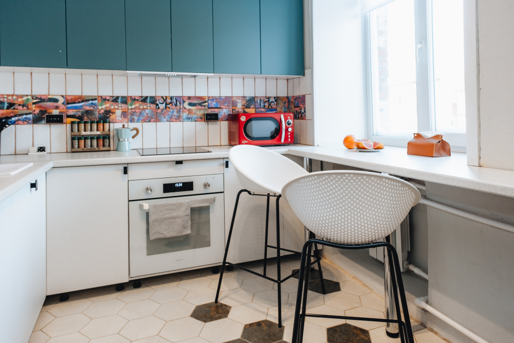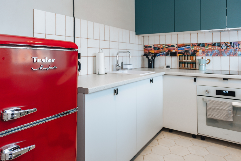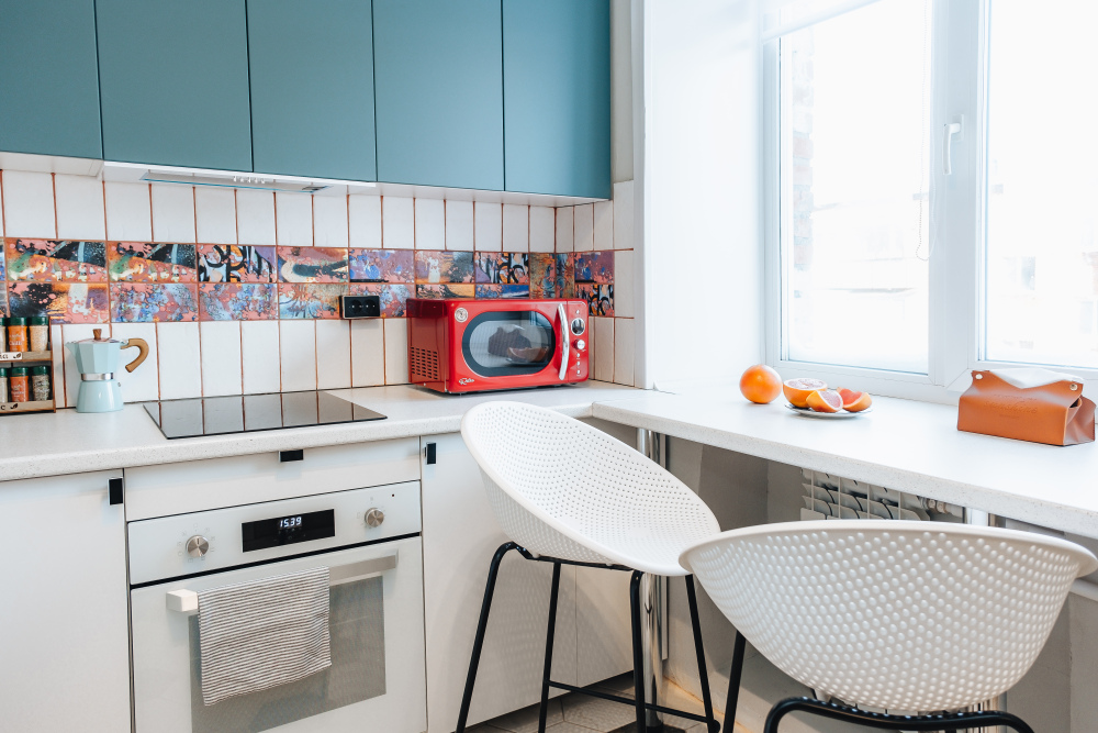- Холодильник, варочная поверхность, духовка, микроволновка, чайник и гейзерная кофеварка.