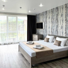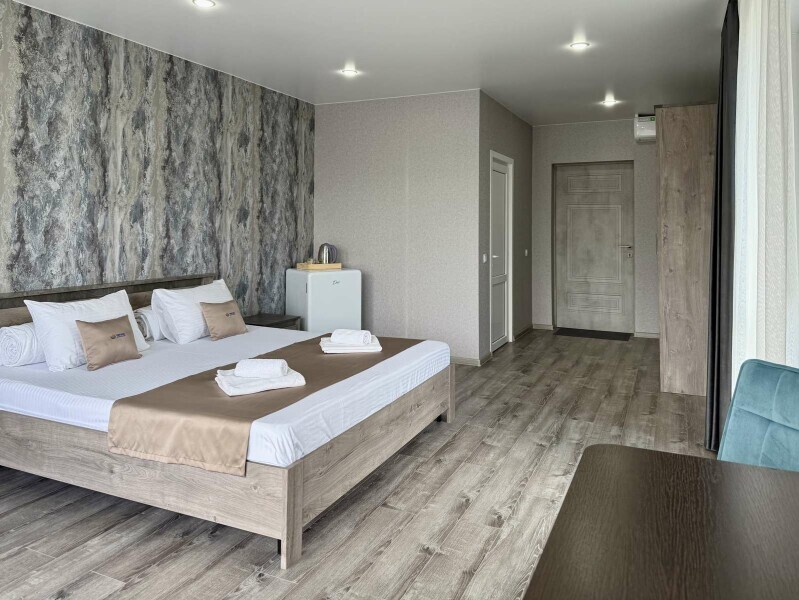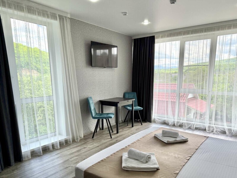 Уютная комната для пар и индивидуальных путешественников, площадью 30 кв.м Просторная комната повышенной комфортности для семьи или компании. Отличный выбор для тех, кто ценит стиль, уют и дополнительное пространство. Просторная двуспальная кровать. Собственная ванная комната с душем, феном и бесплатными косметическими принадлежностями. Телевизор, холодильник, сплит-система, чайник, стол, стулья, прикроватные тумбочки, шкаф . Ламинат, современный интерьер, панорамные окна в пол 2-й и 3-й этажи.