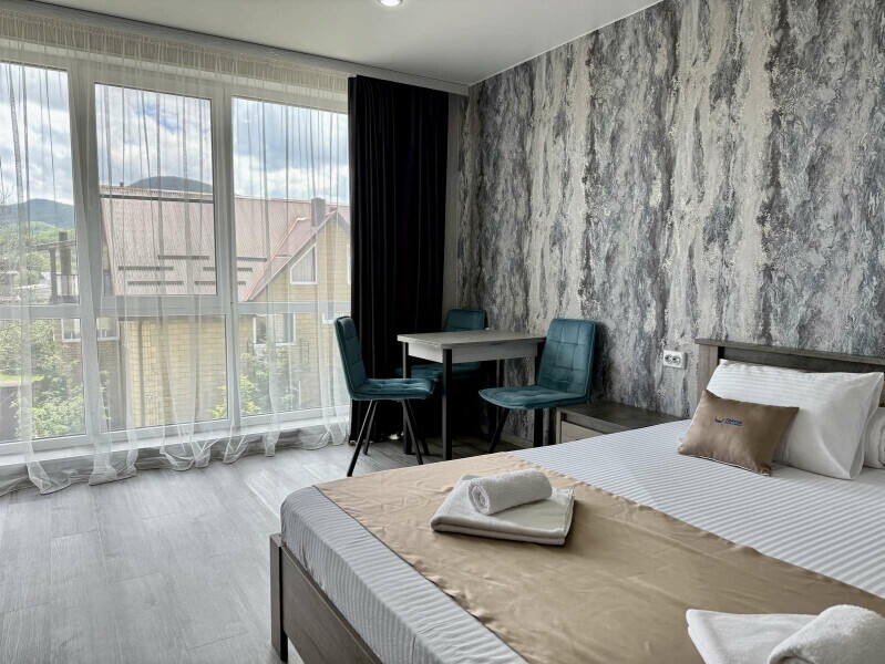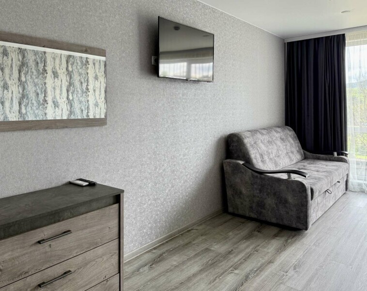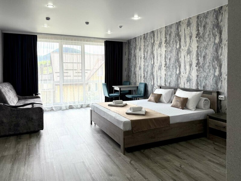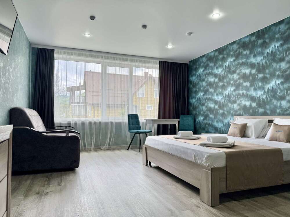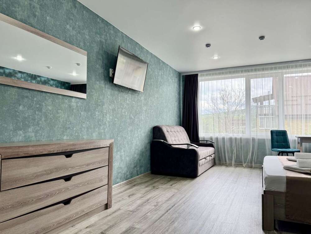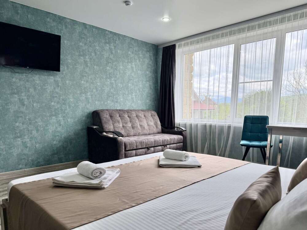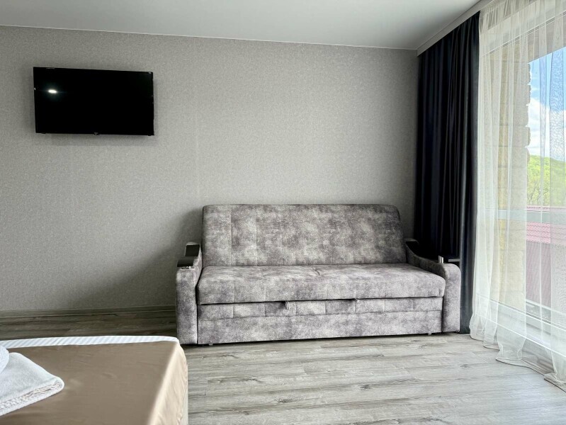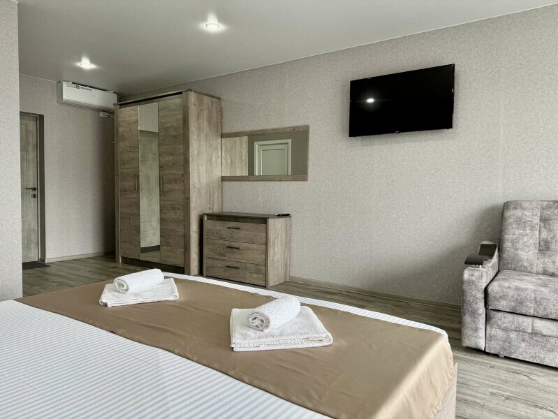 Уютная комната для пар и индивидуальных путешественников, площадью 35 кв.м. Просторная комната повышенной комфортности, подходящая для семьи или небольшой компании. Отличный выбор для тех, кто ценит стиль, уют и дополнительное пространство. — Просторная двуспальная кровать и раскладной диван — Собственная ванная комната с душем, феном и бесплатными косметическими принадлежностями — Телевизор, холодильник, сплит-система, чайник, стол, стулья, прикроватные тумбочки, шкаф — Ламинат, современный интерьер, панорамные окна в пол 2-й и 3-й этажи.