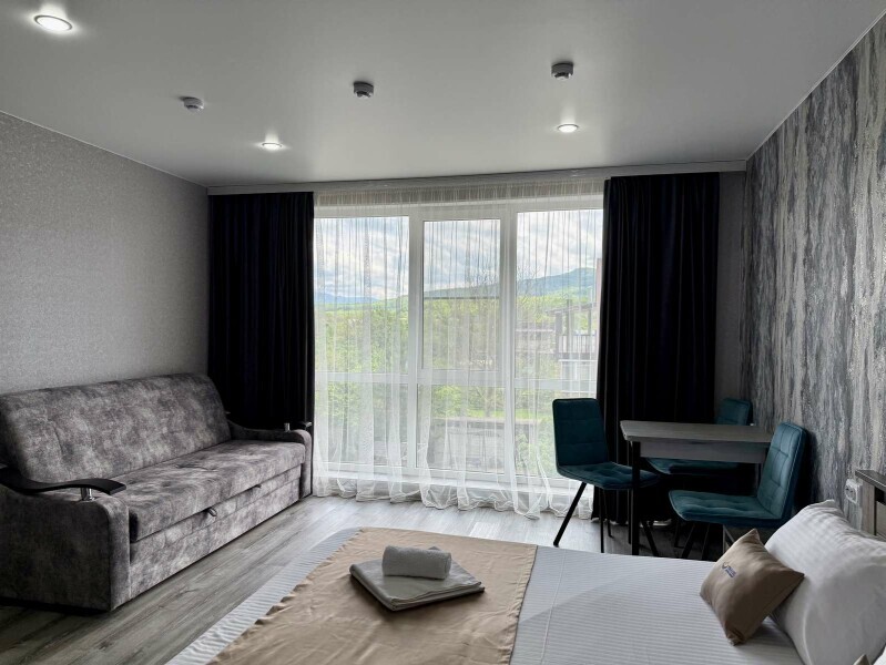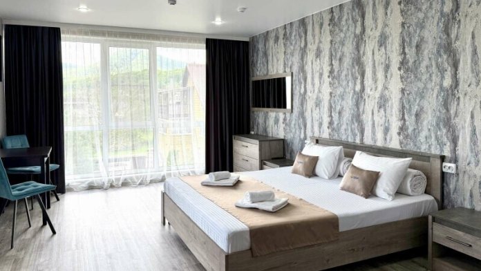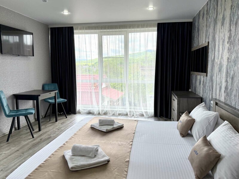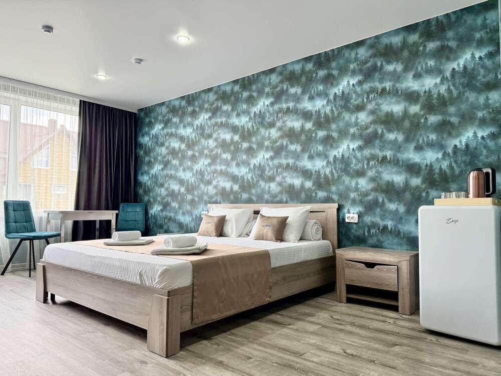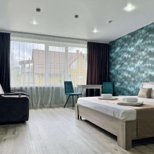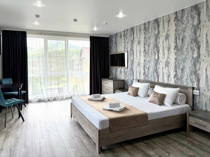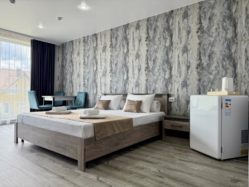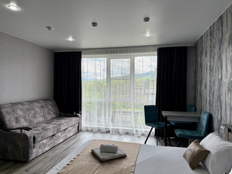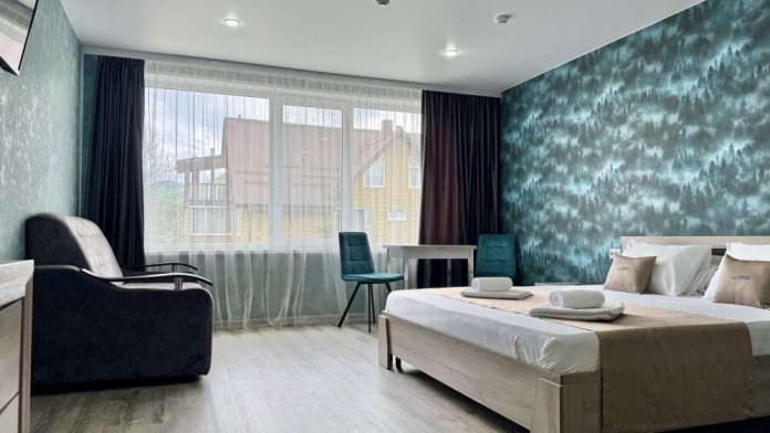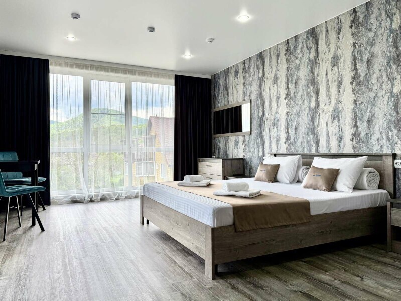 Уютная комната для пар и индивидуальных путешественников, площадью 35 кв.м. Просторная комната повышенной комфортности, подходящая для семьи или небольшой компании. Отличный выбор для тех, кто ценит стиль, уют и дополнительное пространство. — Просторная двуспальная кровать и раскладной диван — Собственная ванная комната с душем, феном и бесплатными косметическими принадлежностями — Телевизор, холодильник, сплит-система, чайник, стол, стулья, прикроватные тумбочки, шкаф — Ламинат, современный интерьер, панорамные окна в пол 2-й и 3-й этажи.