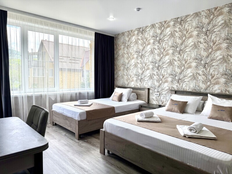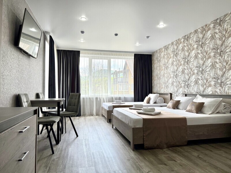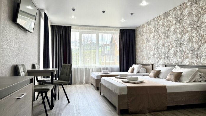 Уютная комната для пар и индивидуальных путешественников, площадью 30 кв.м. Просторная комната повышенной комфортности, подходящая для семьи или небольшой компании. Отличный выбор для тех, кто ценит стиль, уют и дополнительное пространство. — Просторная двуспальная кровать и односпальная кровать — Собственная ванная комната с душем, феном и бесплатными косметическими принадлежностями — Телевизор, холодильник, сплит-система, чайник, стол, стулья, прикроватные тумбочки, шкаф — Ламинат, современный интерьер, панорамные окна в пол 2-й и 3-й этажи.