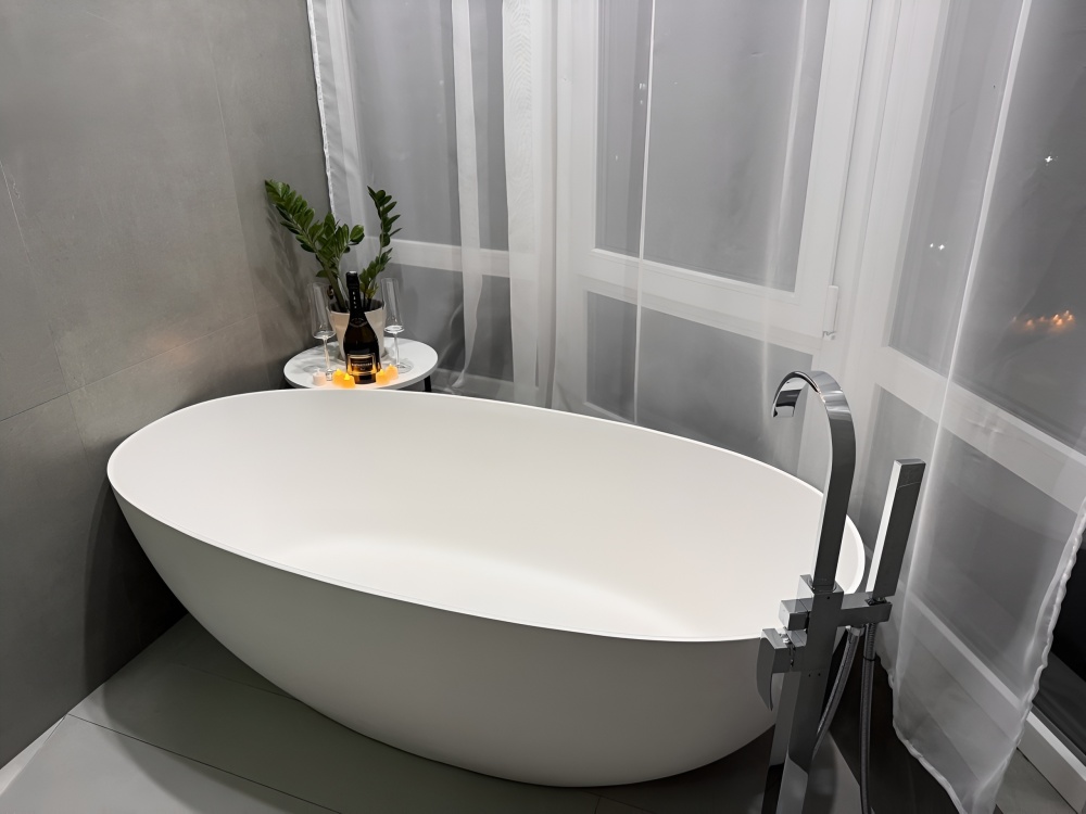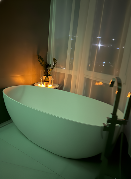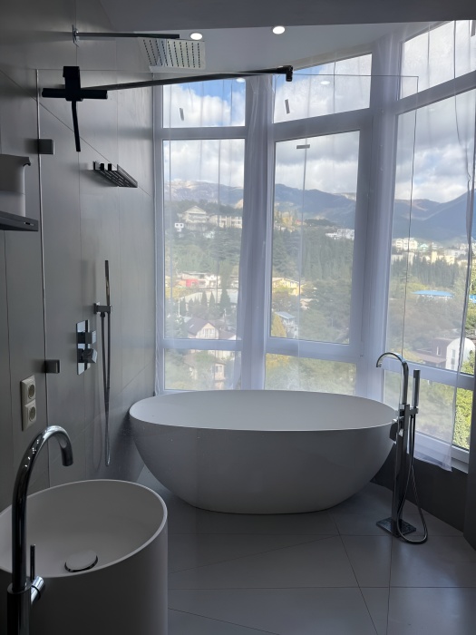 - Эксклюзивный Комфорт: Каменная ванна-чаша с видом на горы, премиальная сантехника (смесители, душевая система с термостатом Abber, тропический душ).
