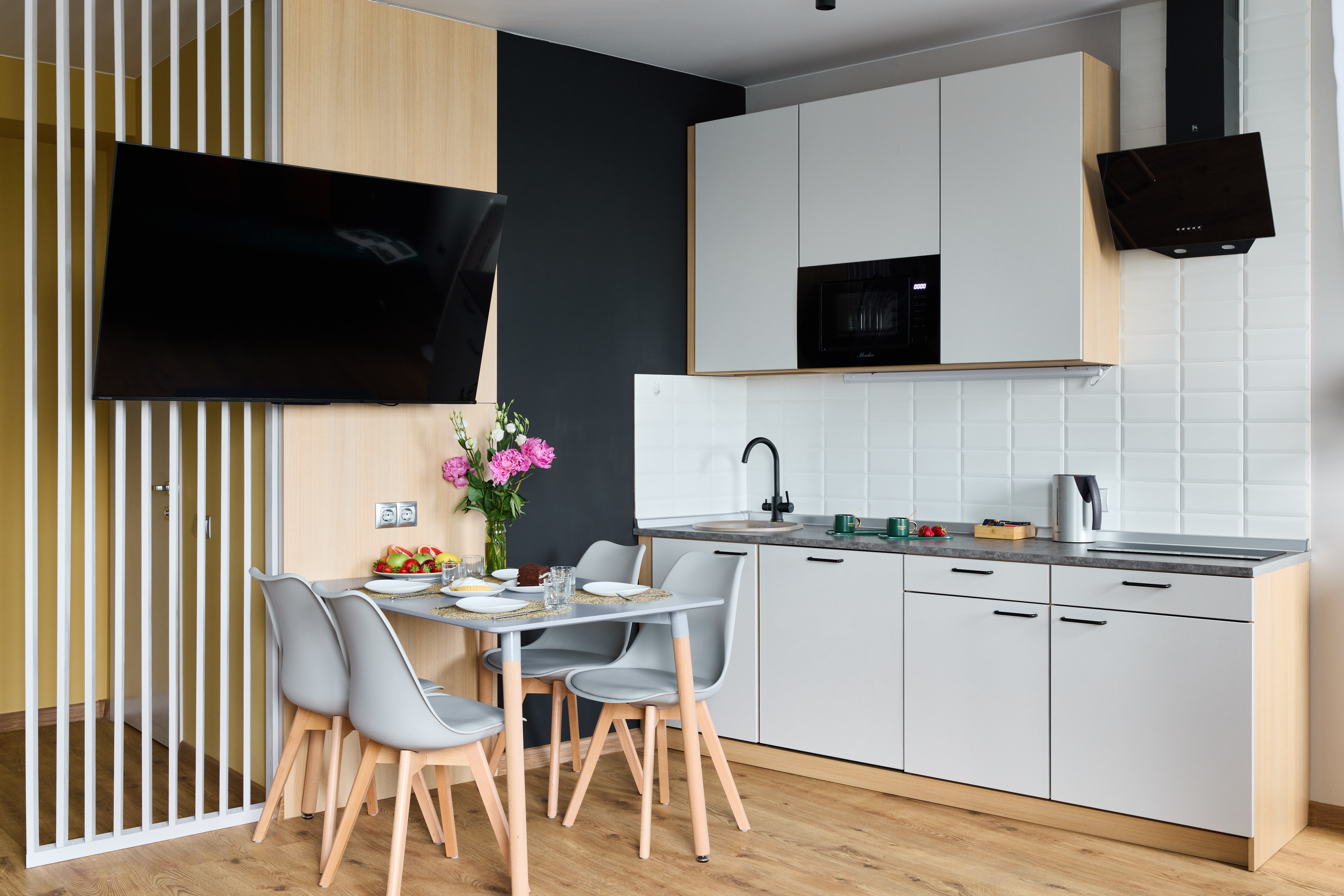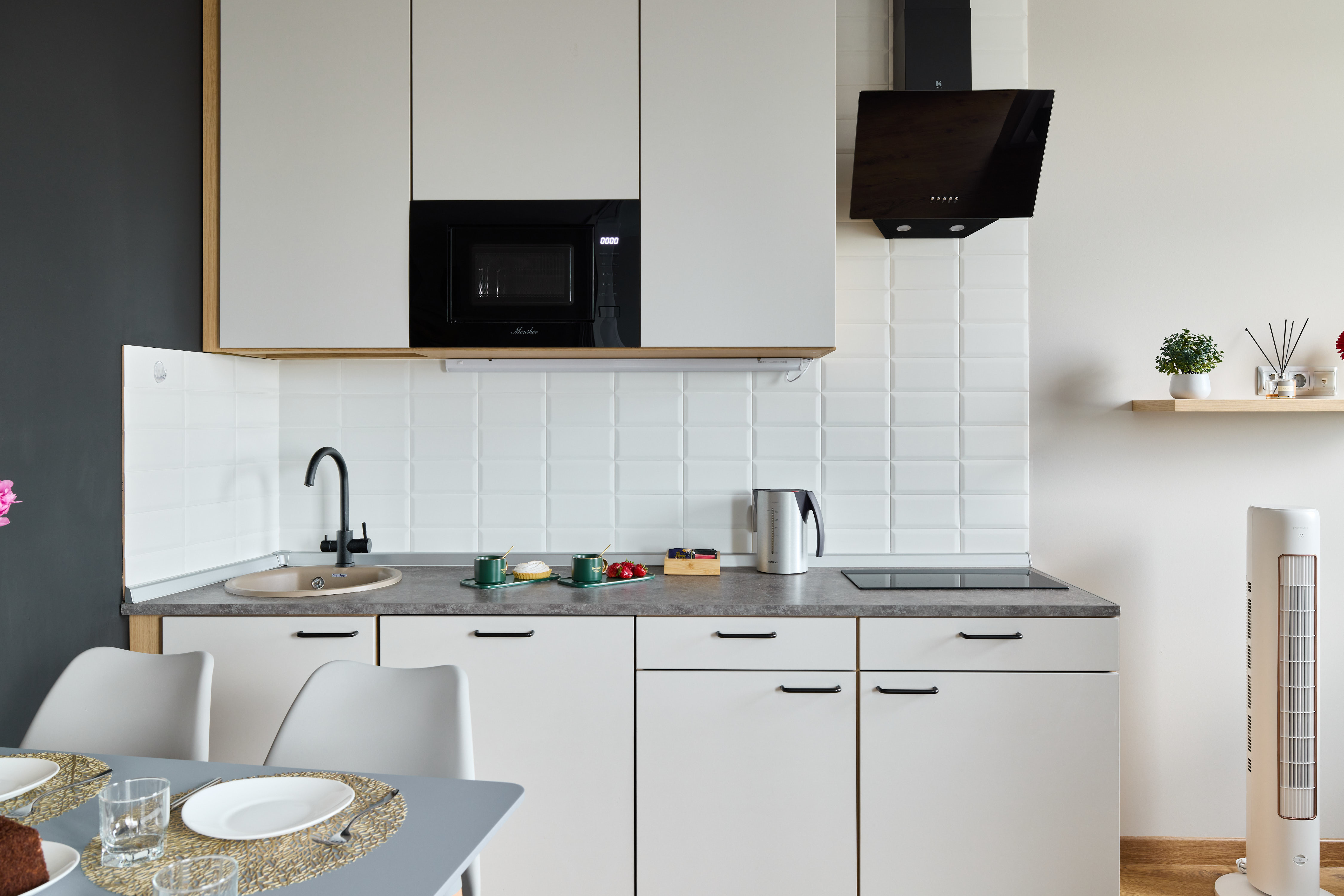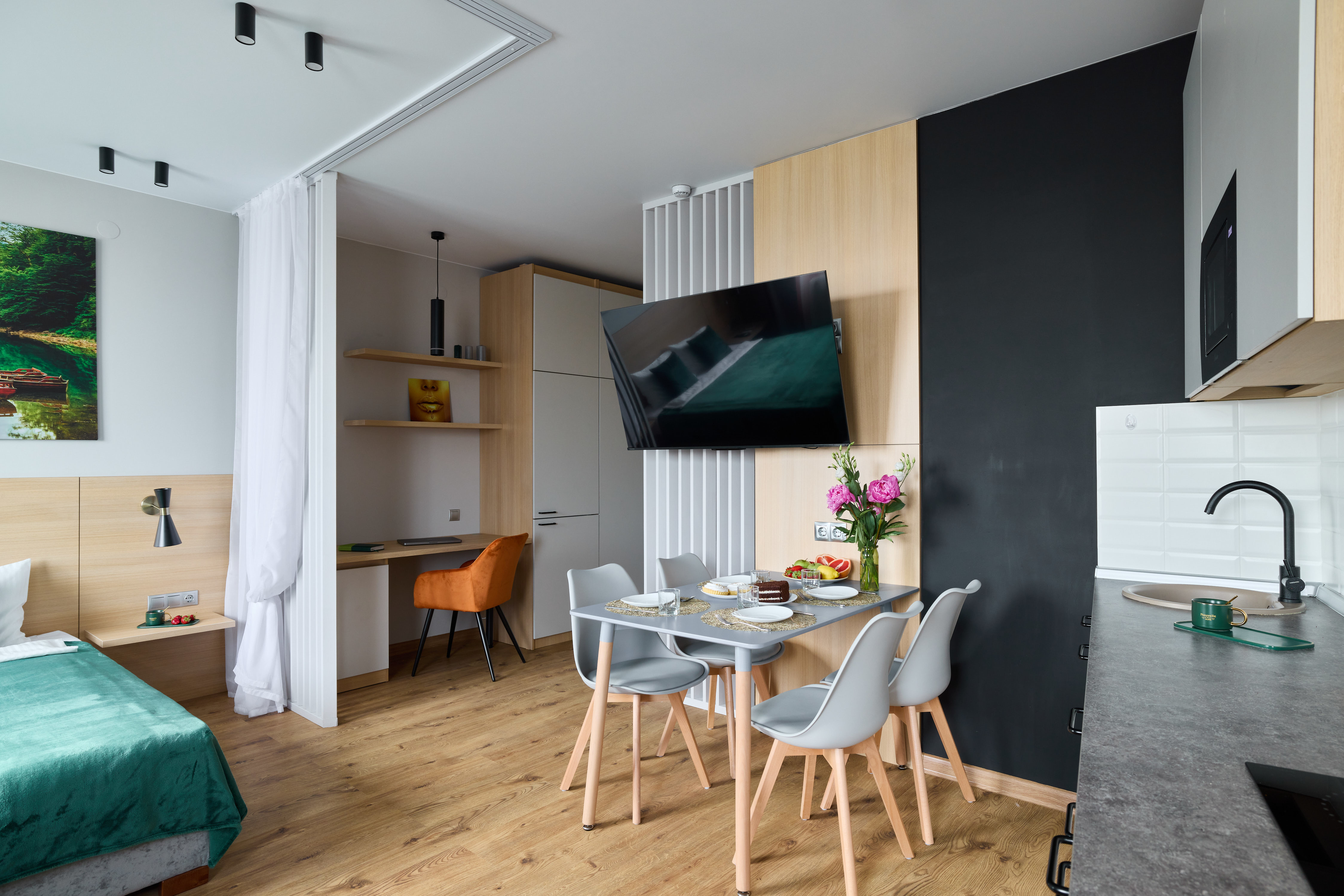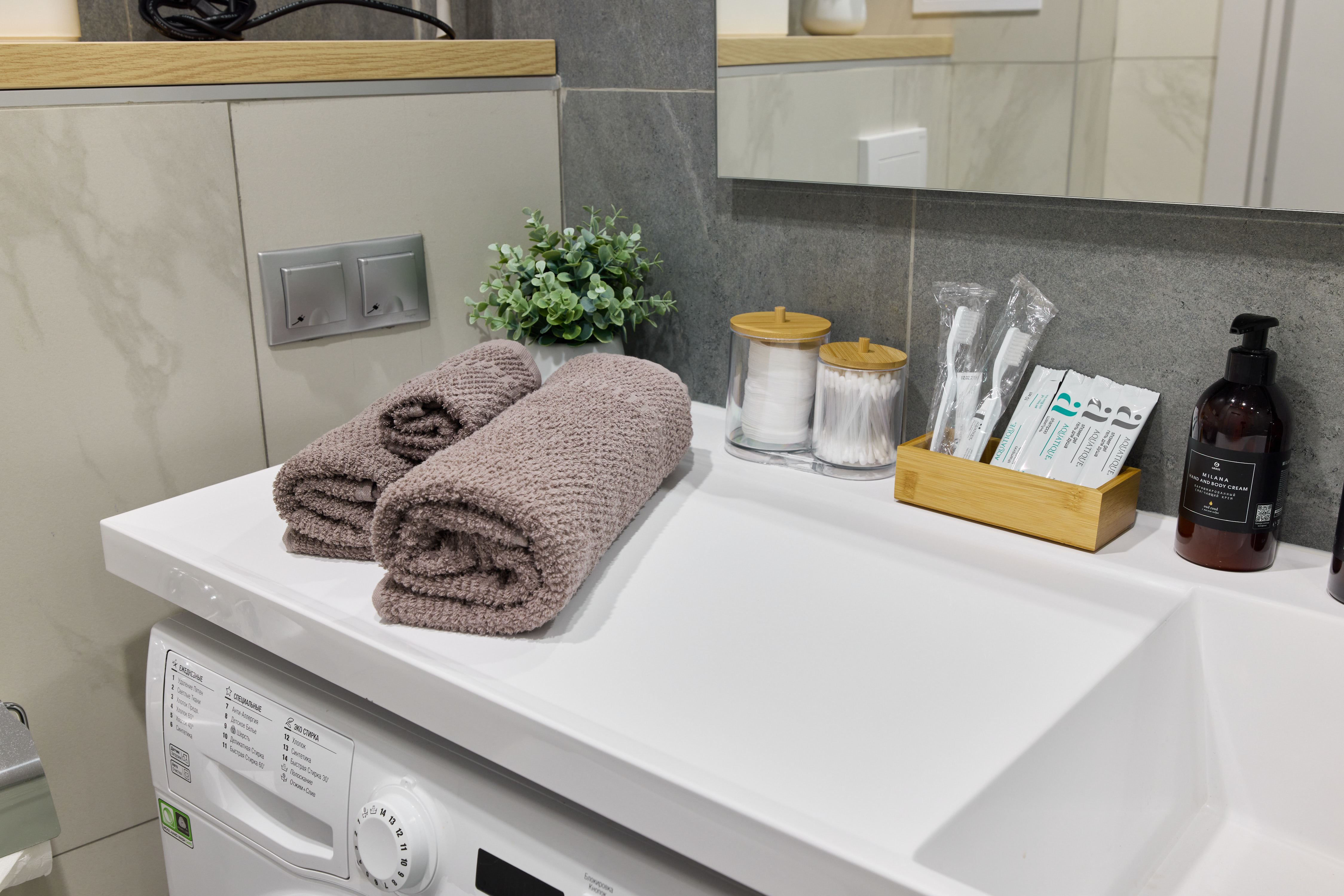 Студия разделена на зоны спальни и зону гостиной. В спальной зоне двуспальная кровать с ортопедическим матрасом повышенной комфортности, что позволяет проснуться утром отдохнувшим и полным сил (проверено нашими гостями!). Спальная зона отделена от гостиной текстилем. Студия так же будет удобна для семей с детьми. В квартире есть все необходимое из техники: плита, вытяжка, посудомоечная машина, стиральная машина и мелкая бытовая техника (чайник, кофемашина, тостер, бутербродница, фен, утюг). Большая (совмещенная) ванная комната с душевой, укомплектованная одноразовой косметикой и пушистыми полотенцами.