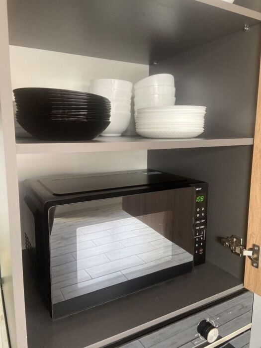- весь набор бытовой техники: ТV (кабельное), посудомойка, холодильник, духовка, микроволновка, утюг с доской, сушка для белья, стиральная машина, кухонная вытяжка, электро плита, чайник , фен.