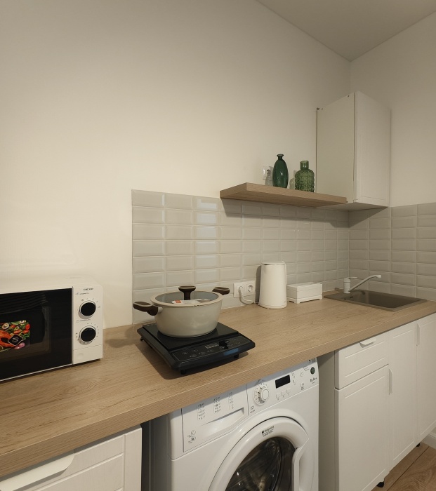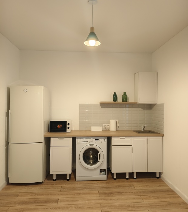 - холодильник, варочная панель, чайник, микроволновая печь, качественная посуда, фен;