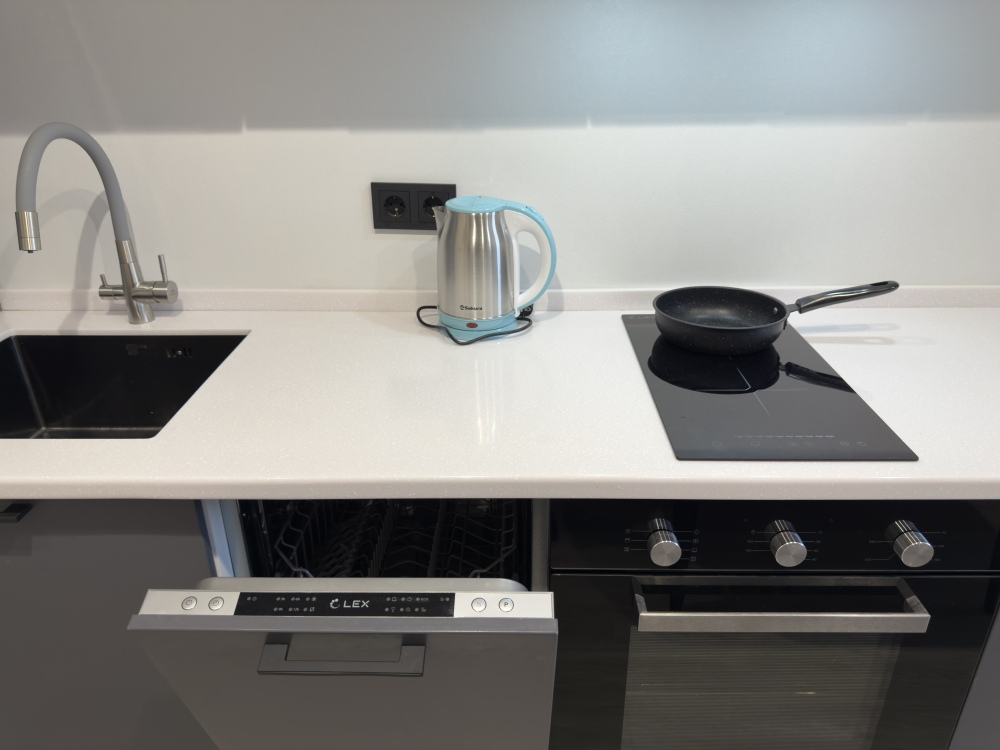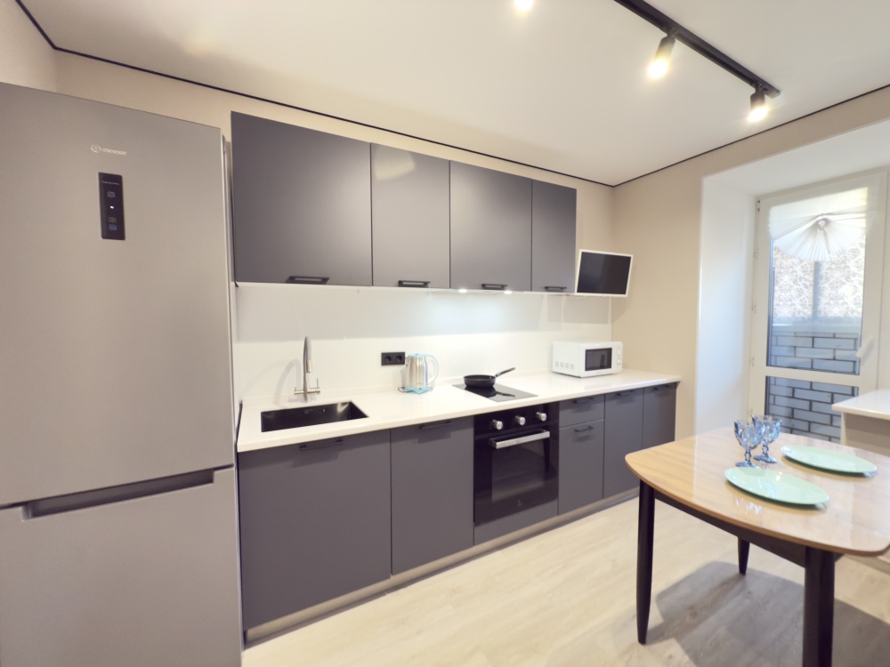 - современная бытовая техника: электрическая плита, двухкамерный холодильник, электрочайник, свч, фен, утюг, стиральная машина, посудомоечная машина.