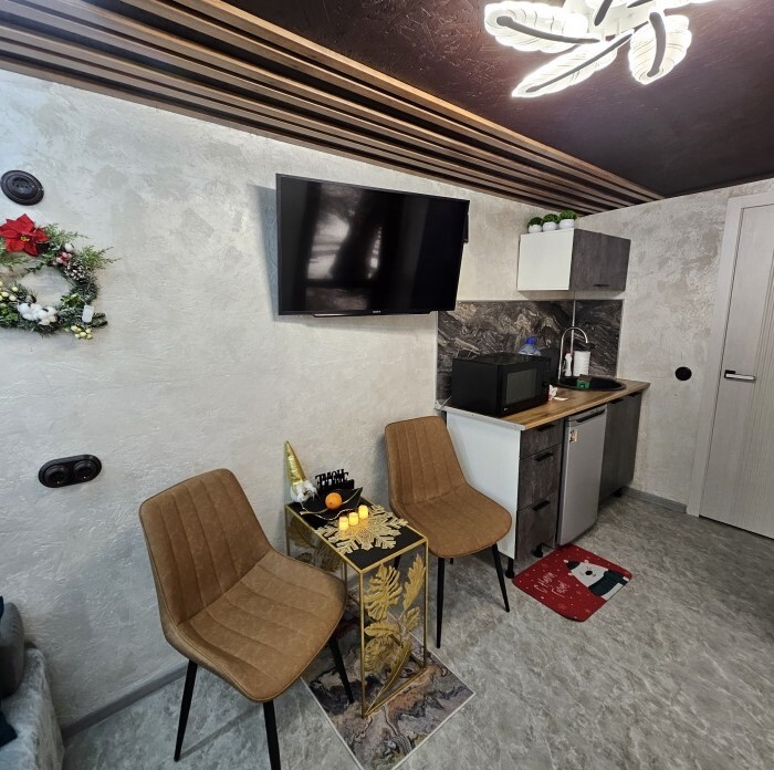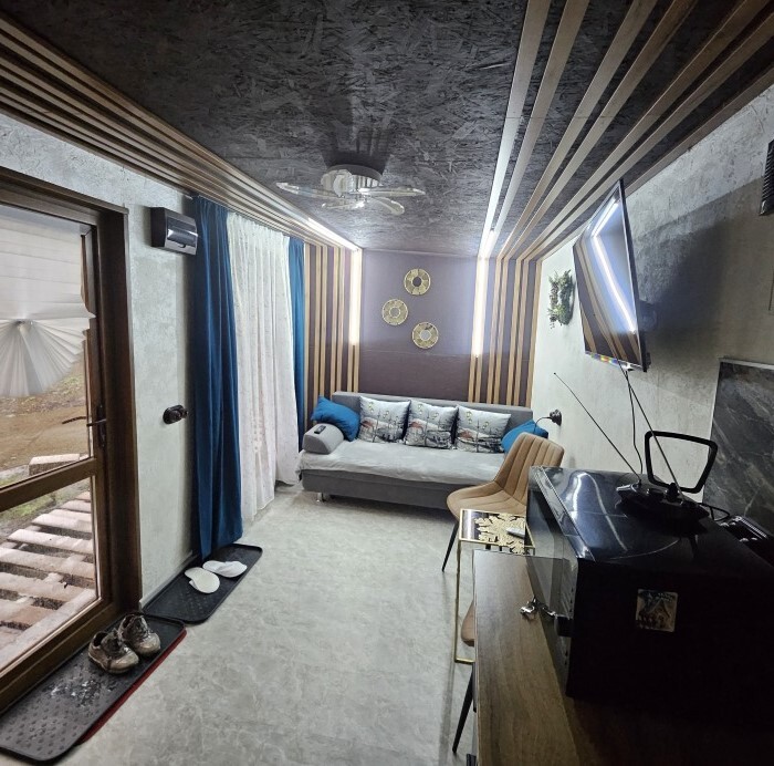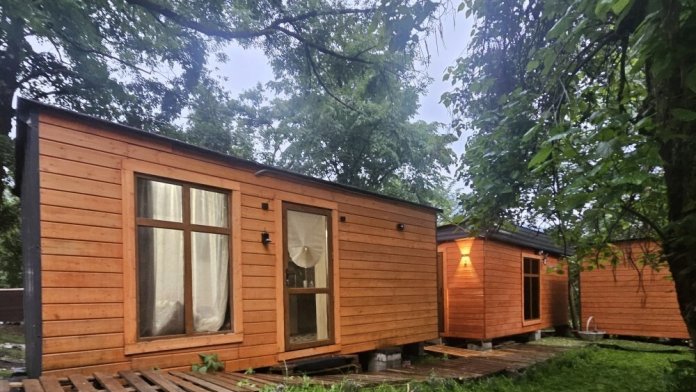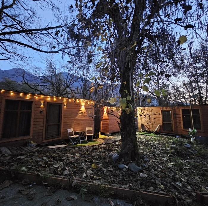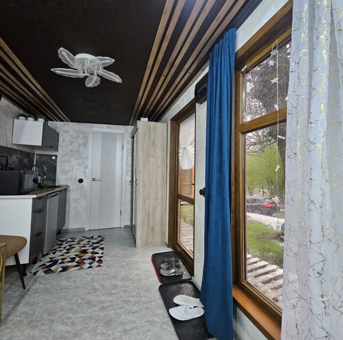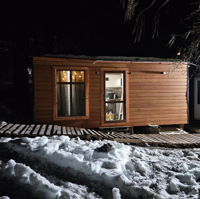 Наши дома - это новые, теплые и уютные помещения, оснащенные всем необходимым для комфортного проживания. В каждом доме есть мини-кухня с микроволновой печью и посудой, шкаф для одежды и удобный двуспальный раскладной диван. В ванной комнате Вас ждут душевая кабина, унитаз с микролифтом и стиральная машин.
