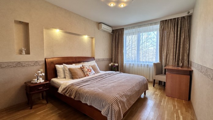 Тепло и уют: просторная спальня с большой кроватью 200×180 см - чтобы каждую ночь Вы высыпались и просыпались с хорошим настроением. Рабочая зона поможет сосредоточиться и подготовиться к важным делам. Раскладное кресло: дополнительное место для отдыха или сна.