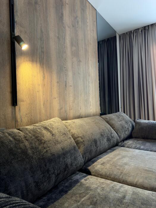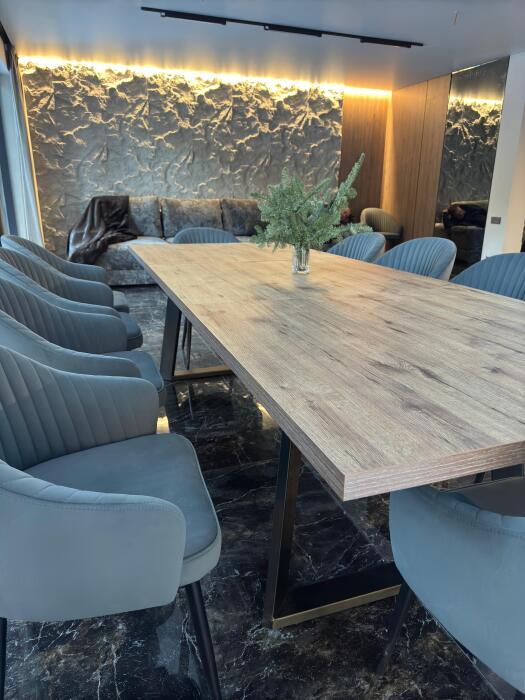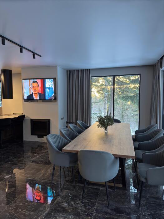 В зале имеются: трапезная зона со столом на 10 персон, комфортабельный 4 метровый раскладной диван, телевизор последнего поколения, с удобным голосовым помощником на панели пульта. Огромный выбор каналов, фильмов и музыки, различные приложения, с платными подписками: все для комфортного просмотра кино семейными вечерами. Также в гостиной имеется два вида освещения: основное и парящий контур подсветки над изголовьем дивана, который спроектирован специально для создания более уютной атмосферы для постояльцев нашего клуба.
