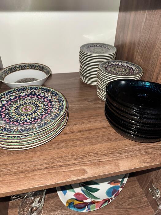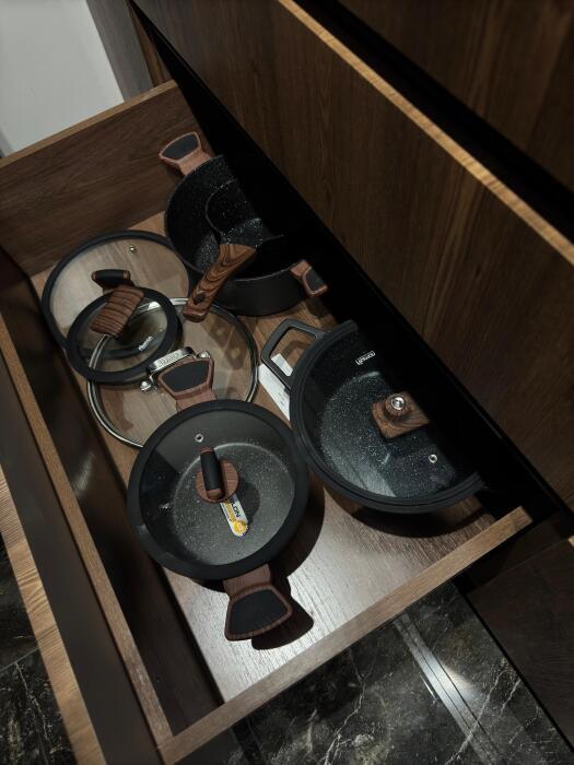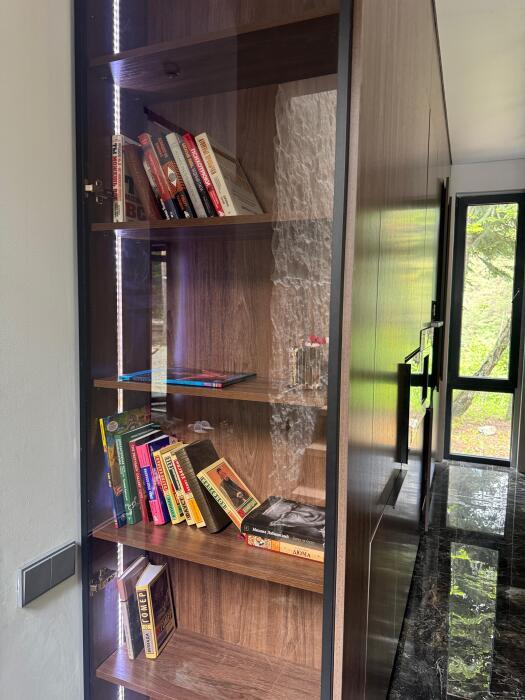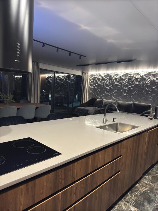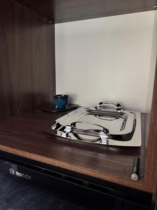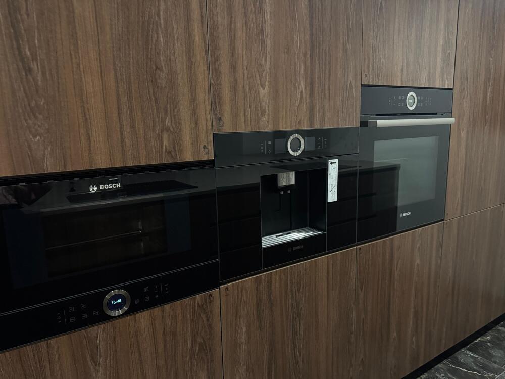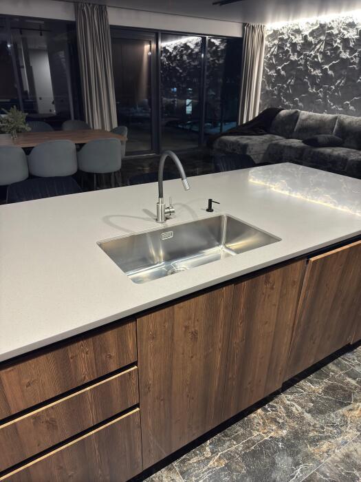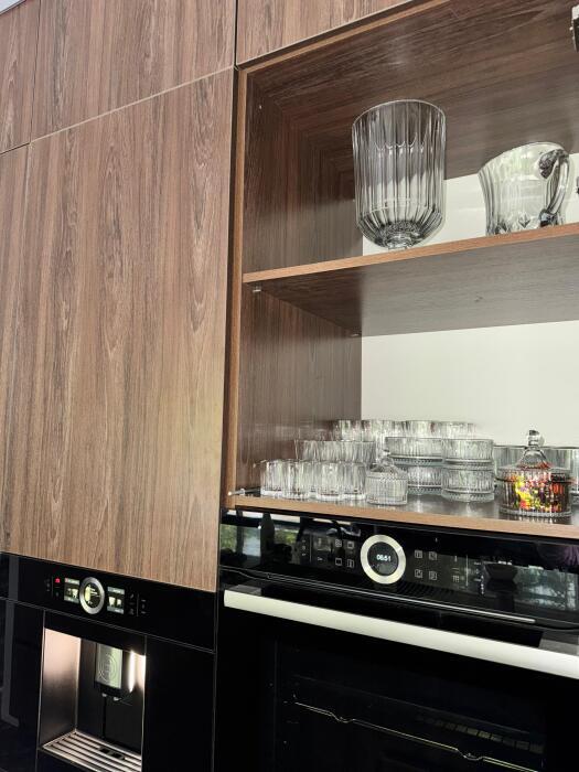 Кухонная зона делится на 2 составляющие: пенал и остров. Оснащена высококачественной встроенной мойкой из экологичной нержавеющей стали японского бренда OMOIKIRI, техникой: посудомоечной машиной, варочной плитой, встроенным духовым шкафом, встроенным холодильником и встроенной кофемашиной. Кухонную зону с залом разделяет остров, который служит столешницей для готовки с одной стороны, и барной стойкой, где вы можете быстро перекусить/ выпить утренний кофе, или подать блюда на стол, с другой стороны. Здесь есть вся необходимая посуда, а также бытовые средства.